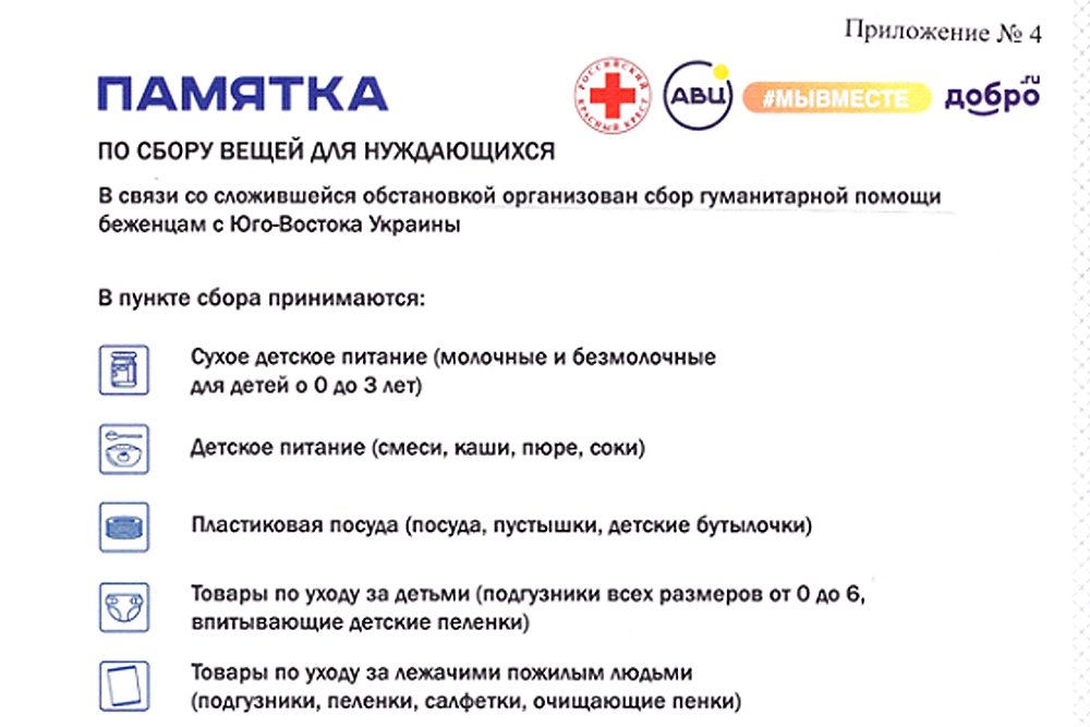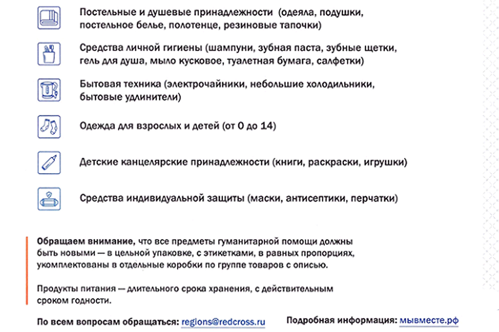 Центр «МыВместе» принимает детское питание, пластиковую посуду, товары по уходу за детьми, постельное белье и душевые принадлежности, средства личной гигиены, мелкую бытовую технику, одежду, канцелярские товары для детей и средства индивидуальной защиты.