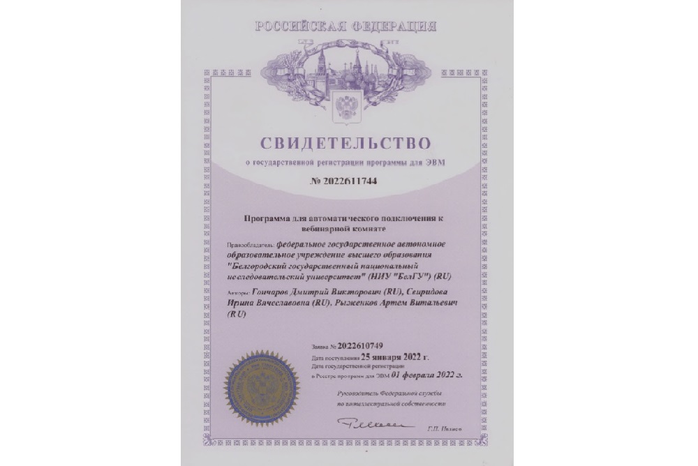 В ходе выполнения проекта было получено свидетельство о государственной регистрации программы для ЭВМ, зарегистрированное в Федеральной службе по интеллектуальной собственности. В настоящий момент программа позволяет осуществлять автоматический вход в «СЭО Пегас» и подключаться к вебинарной комнате BigBlueButton, одномоментно включать микрофон, вебкамеру и запись занятия.