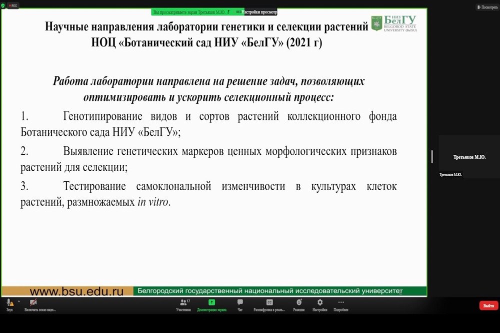 Директор НОЦ «Ботанический сад НИУ «БелГУ», Валерий Тохтарь сообщил, что совсем недавно в ботаническом саду была разработана программа исследований на несколько лет, начата ее реализация. Совместно с зарубежными коллегами выполняется проект по изучению генетической изменчивости североамериканского инвазионного вида Conyza canadensis (мелколепестник канадский). Исследования, проводимые совместно с учеными Главного ботанического сада РАН, направлены на выявление генетических механизмов, которые определяют махровость цветка у сирени, а также проанализировано строение участков хлоропластной ДНК мелколепестника канадского. Было установлено, что распространение этого вида вдоль Транссибирской магистрали происходит с Запада на Восток страны. С Центральным ботаническим садом Беларуси исследуются генетические маркеры сортов сирени. Подготовлены новые совместные публикации по генетическим исследованиям.