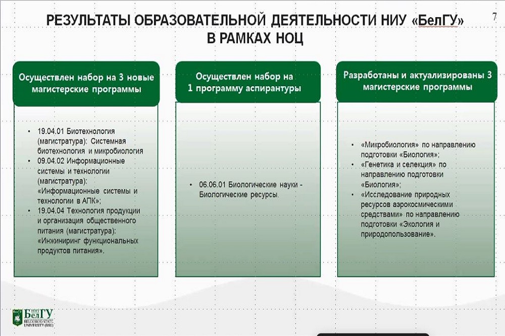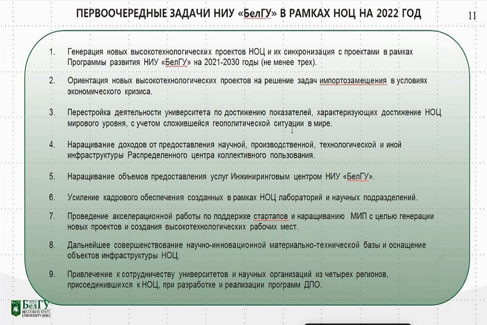 Особое внимание Николай Иванович уделил созданию пяти новых лабораторий и трёх подразделений, в числе которых Объединённый центр генетических технологий, Офис распределённого центра коллективного пользования НОЦ «Инновационные решения в АПК» и Центр управления проектами НОЦ с участием НИУ «БелГУ». Остановился он и на проектах, получивших мировое признание.