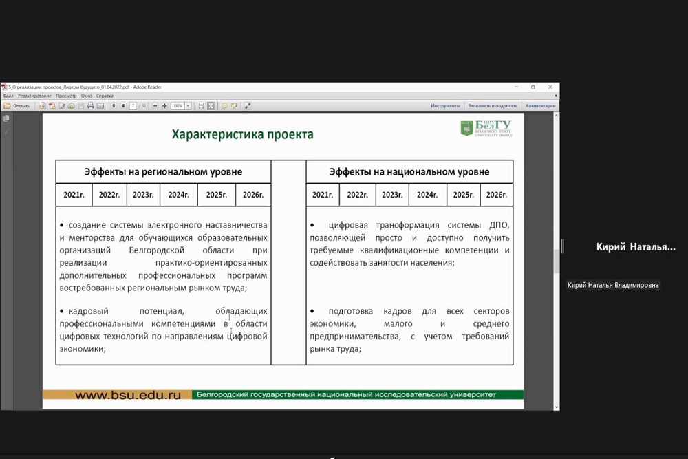Реализацию проекта «Дополнительное профессиональное образование» на базе НИУ «БелГУ» обсудили на заседании Совета платформы «Лидеры Будущего» под руководством проректора по образовательной деятельности Александра Маматова. Как рассказала директор Центра развития компетенций НИУ «БелГУ» Наталья Кирий, рассчитанный на пять лет проект направлен на улучшение качества подготовки профессиональных кадров. К 2026 году Центр должен предоставить не менее 50 новых образовательных программ непрерывного дополнительного профессионального образования.