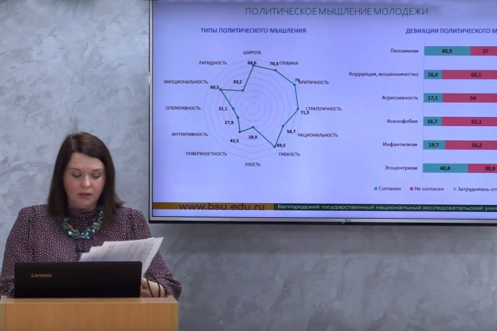 Говоря о политическом мышлении молодёжи, лектор обратила внимание на то, что, помимо характеристик, оно имеет и так называемые девиации – отклоняющиеся от нормы модели мыслительных процессов, основанные на ложных данных, поведенческих моделях и политических практиках. По словам профессора, они возникают в результате нарушения политической социализации при формировании политического мышления.