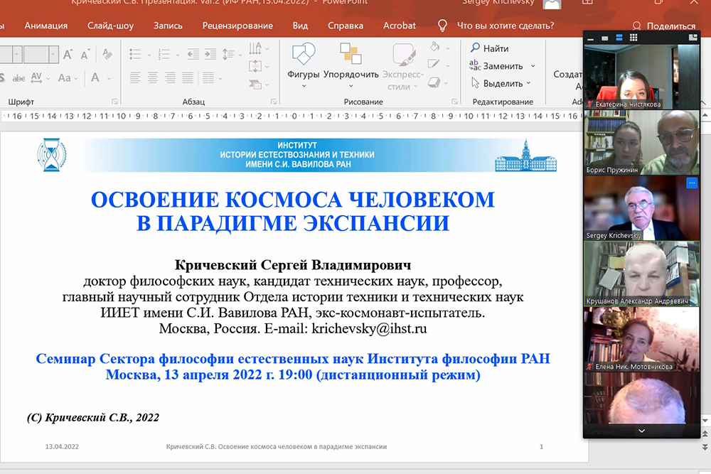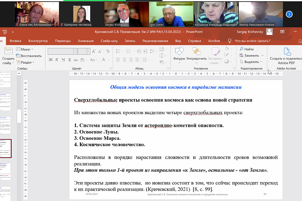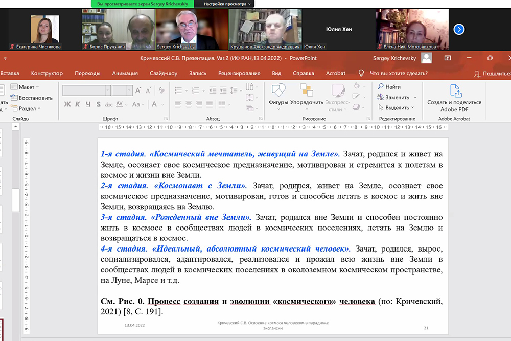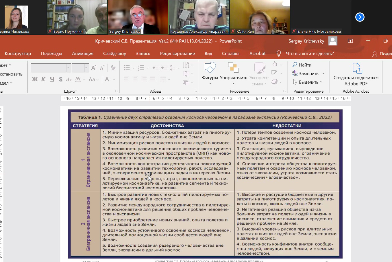 Для справки: междисциплинарный методологический семинар организован Институтом философии РАН совместно с НИУ «БелГУ», к его работе приглашены российские и зарубежные учёные, представители естественных и гуманитарных наук. Заинтересовавшиеся темой освоения космоса в парадигме экспансии могут ознакомиться с тезисами выступления С. Кричевского и записью самого семинара.