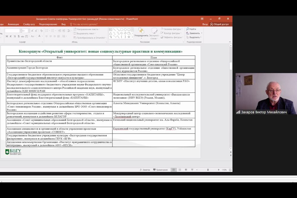Одной из тем обсуждения стало включение новых участников в консорциум «Открытый университет: новые социокультурные практики и коммуникации», который в данный момент сформирован на 90%. В его состав вошли: правительство Белгородской области и администрация Белгорода, Совет муниципальных образований Белгородской области, благотворительный фонд «Капитаны», Союз пенсионеров России, и другие. Как отметил руководитель платформы «Университет без границ» – директор института экономики и управления НИУ «БелГУ» Виктор Захаров, объединение решили сделать открытым, новые участники могут присоединиться к проекту в любой момент.