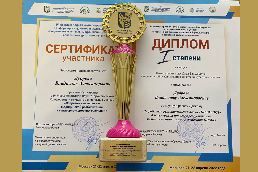 Доклад студента 6 курса медицинского института НИУ «БелГУ» Владислава Дубровы «Разработка функциональной доски «бизиборд» для ускорения процесса реабилитации мелкой моторики у лиц, перенесших ОНМК» удостоен диплома I степени IV Международной научно-практической конференции студентов и молодых учёных «Современные аспекты медицинской реабилитации и санаторно-курортного лечения».
