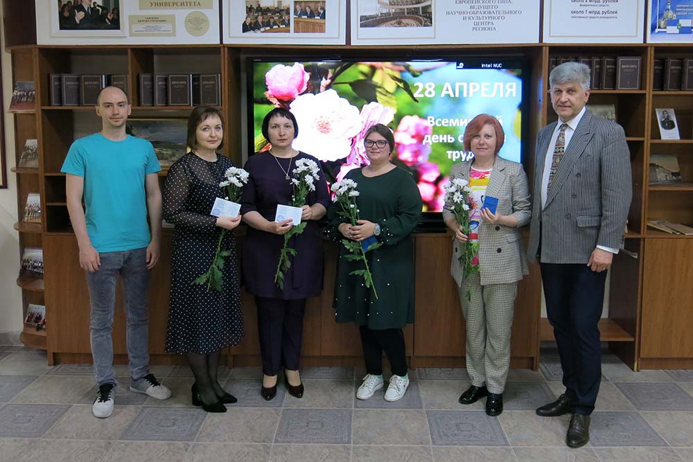 К 20-летию со дня празднования Всемирного дня охраны труда в России председатель профкома НИУ «БелГУ» Валерий Тимофеев приурочил вручение именных профсоюзных билетов директору цнтра охраны труда и экологии НИУ «БелГУ» Ольге Воеводской, начальнику отдела охраны труда Ольге Веселовой, начальнику отдела экологии Юлии Бугловой, специалисту в области охраны труда отдела охраны труда Юлии Семыкиной и специалисту по радиационной безопасности отдела экологии Светлане Лактионовой.