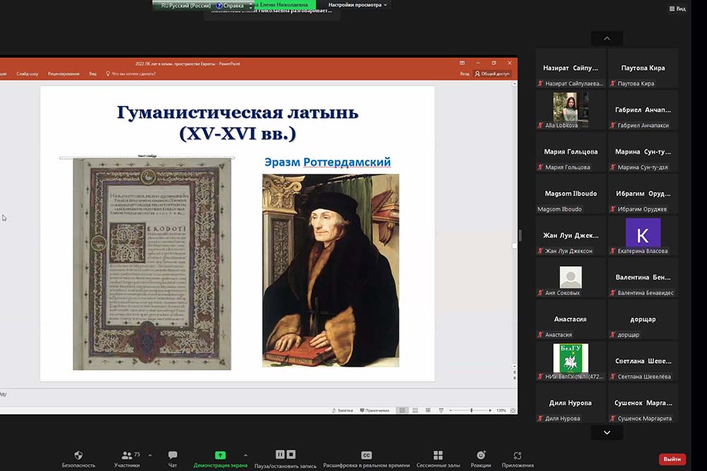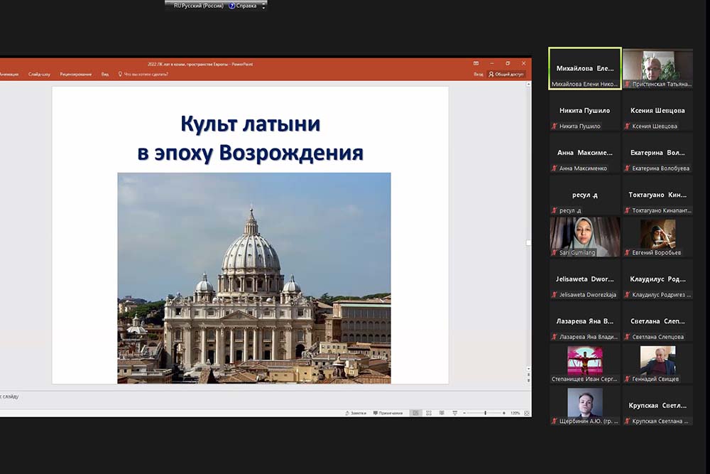 В заключение Елена Николаевна акцентировала внимание слушателей на роли многовекового латиноязычного литературного и научного наследия в процессе создания новых литературных языков и национальных литературных и научных традиций в разных странах Европы. Благодаря глубокому изучению этого языка на разных этапах истории языкознания были сделаны фундаментальные открытия в области теории языка и заложены основы для многовекторности научного поиска в лингвистике.