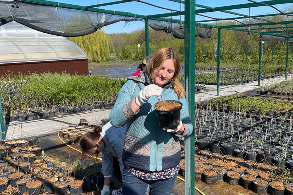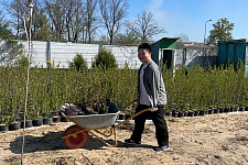 Волонтёры продолжили трудиться в питомнике, перемещая из зимнего хранилища на открытые площадки саженцы садовых и декоративных культур.