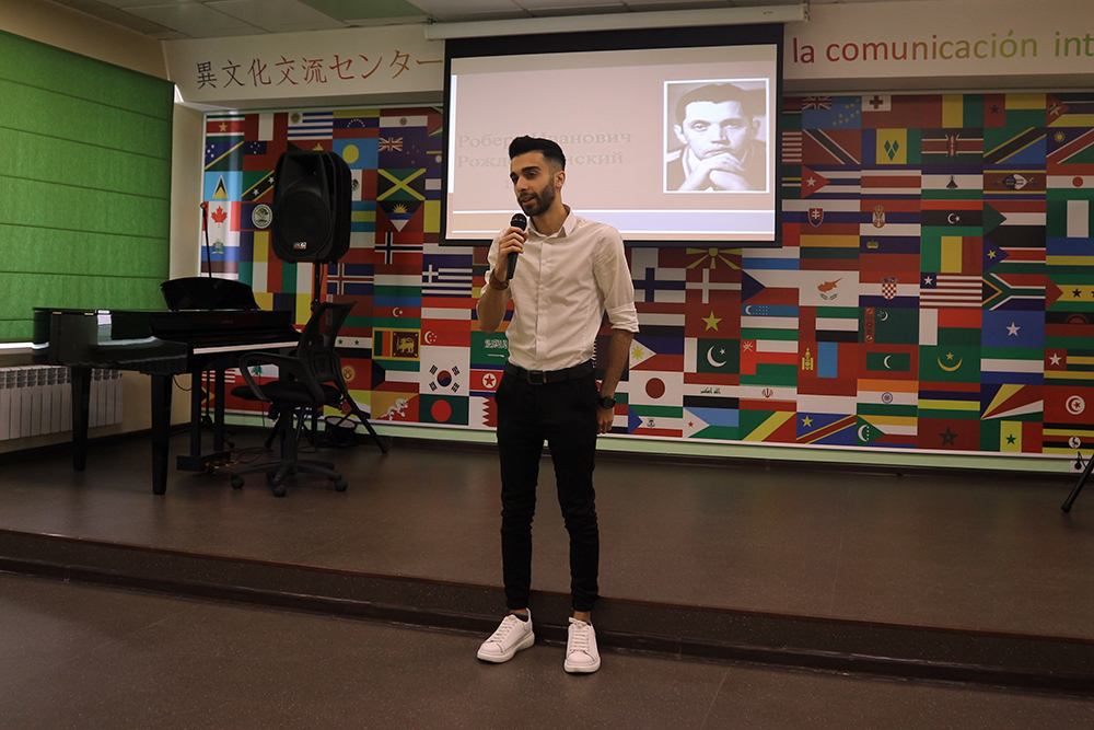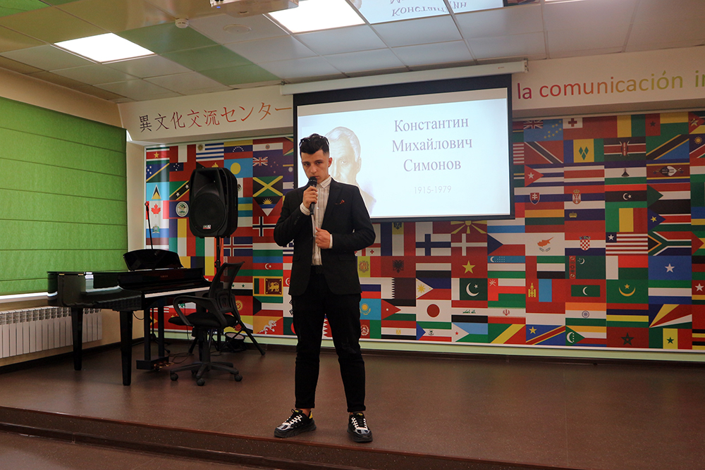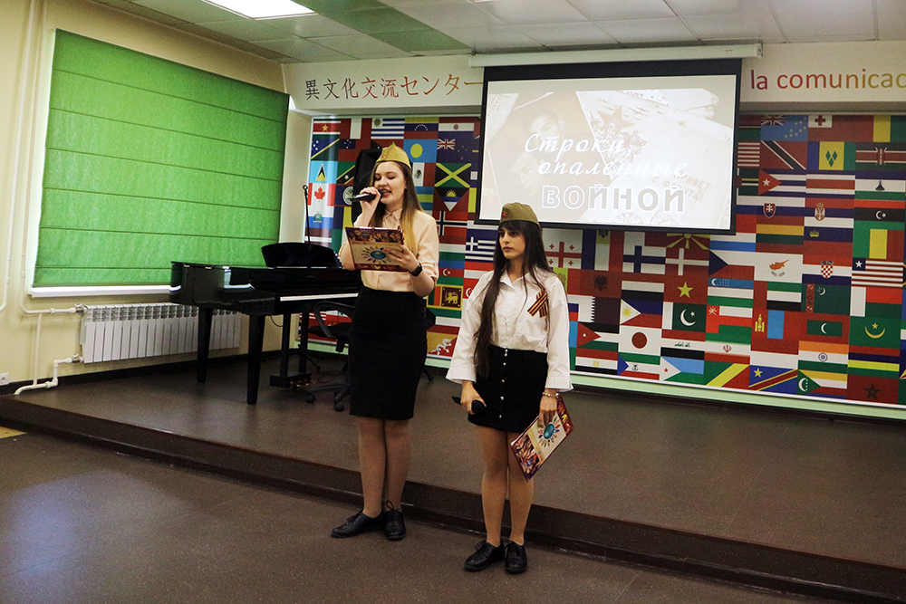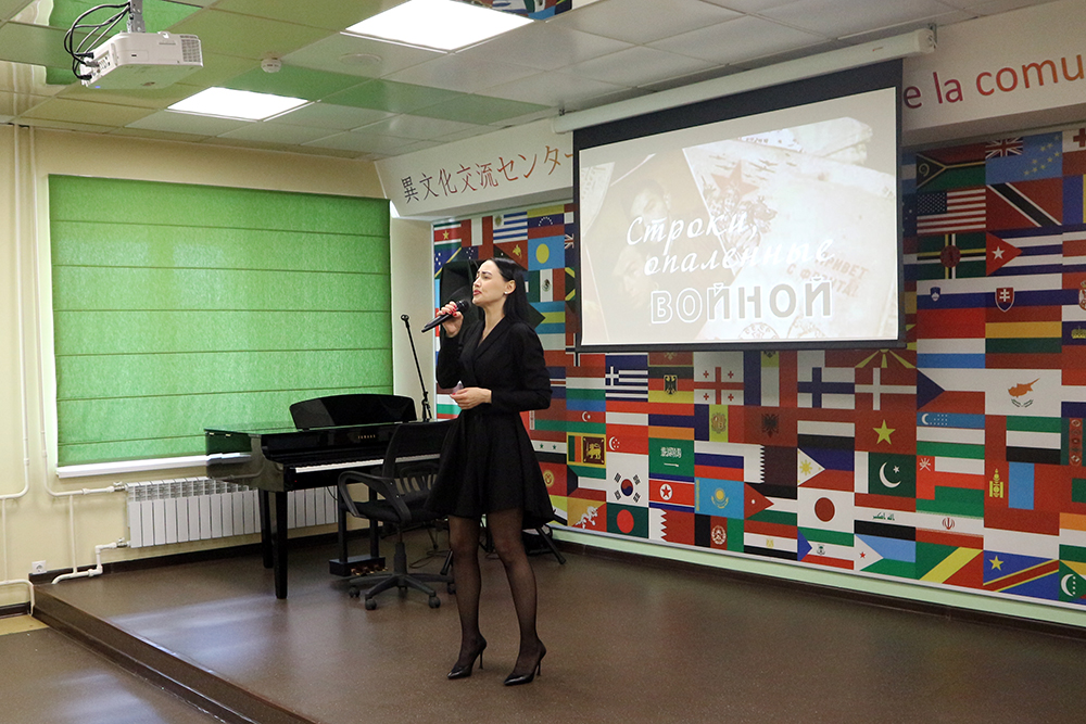 В исполнении студентов-иностранцев, директора Центра межкультурной коммуникации Кристины Хабаровой прозвучали песни и стихотворения о войне известных советских поэтов: Владимира Высоцкого, Семёна Гудзенко, Константина Симонова, Булата Окуджавы, Роберта Рождественского, Евгения Евтушенко и других.