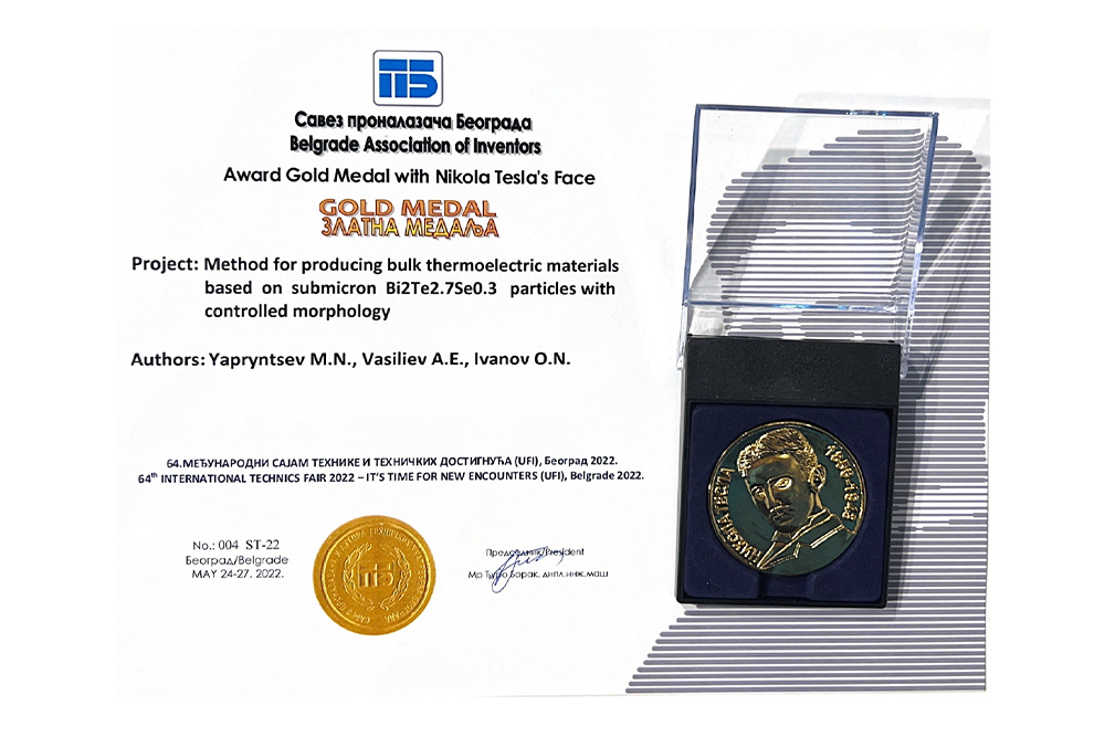 По итогам выставки высшей наградой отмечено изобретение учёных НИУ «БелГУ» в области энергосбережения – способ получения объемных термоэлектрических материалов на основе субмикронных частиц висмута, теллура и селена с контролируемой морфологией, разработанный под руководством кандидата физико-математических наук, научного сотрудника ЦКП «Технологии и материалы НИУ «БелГУ» Максима Япрынцева.