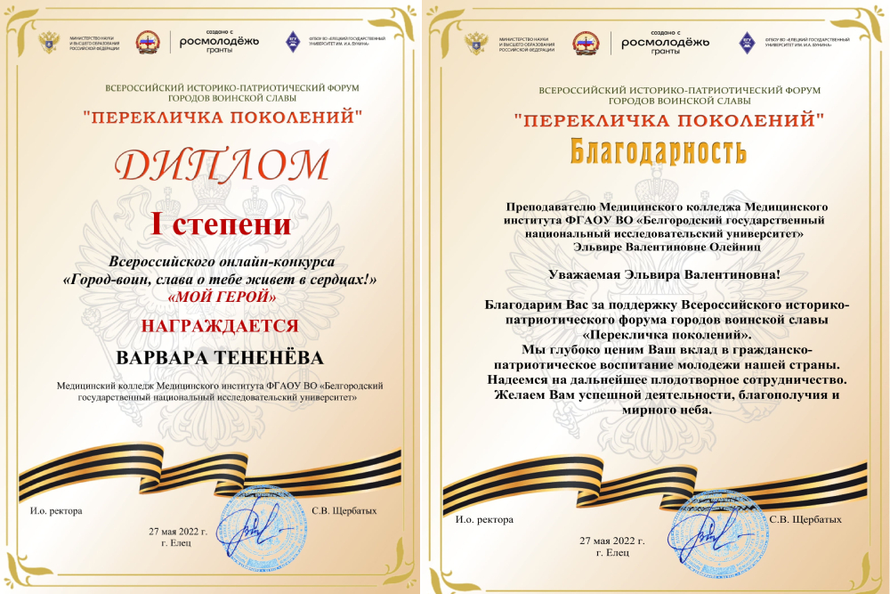 Для справки: Всероссийский онлайн-конкурс «Город-воин, слава о тебе живёт в сердцах!» состоялся в рамках Всероссийского историко-патриотического форума городов воинской славы «Перекличка поколений». Проект реализуется при грантовой поддержке Федерального агентства по делам молодёжи (Росмолодёжь) Елецким государственным университетом им. И.А. Бунина.