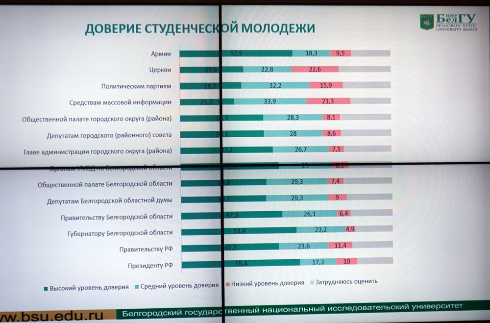 Результаты социологического опроса «Общественное настроение студенческой молодежи» представила заведующая кафедрой социологии и организации работы с молодёжью института общественных наук и массовых коммуникаций НИУ «БелГУ», руководитель Международного центра социологических исследований, доктор социологических наук, профессор Инна Шаповалова. Инна Сергеевна отметила, что по данным исследования, у молодых людей заметно возросли патриотические настроения и ценность семьи. Также у обучающихся увеличилось доверие к Президенту страны, армии, губернатору Белгородской области, государственной и региональной власти.