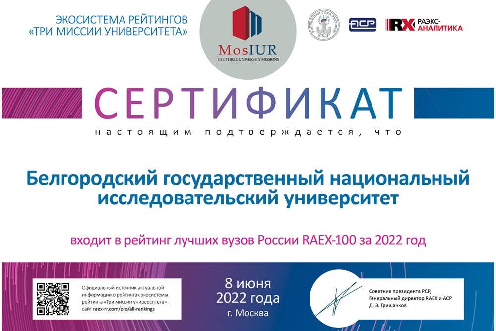 По результатам рейтинга лучших вузов России RAEX-100, который является авторитетным ориентиром для университетов, абитуриентов, работодателей и экспертного сообщества, НИУ «БелГУ» закрепился на 38-й позиции.