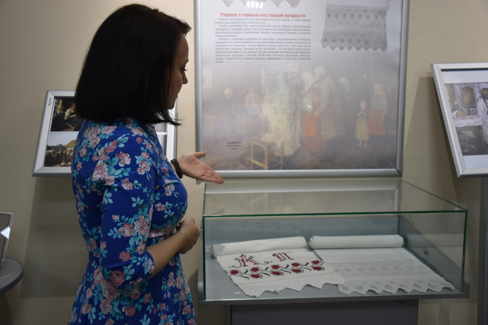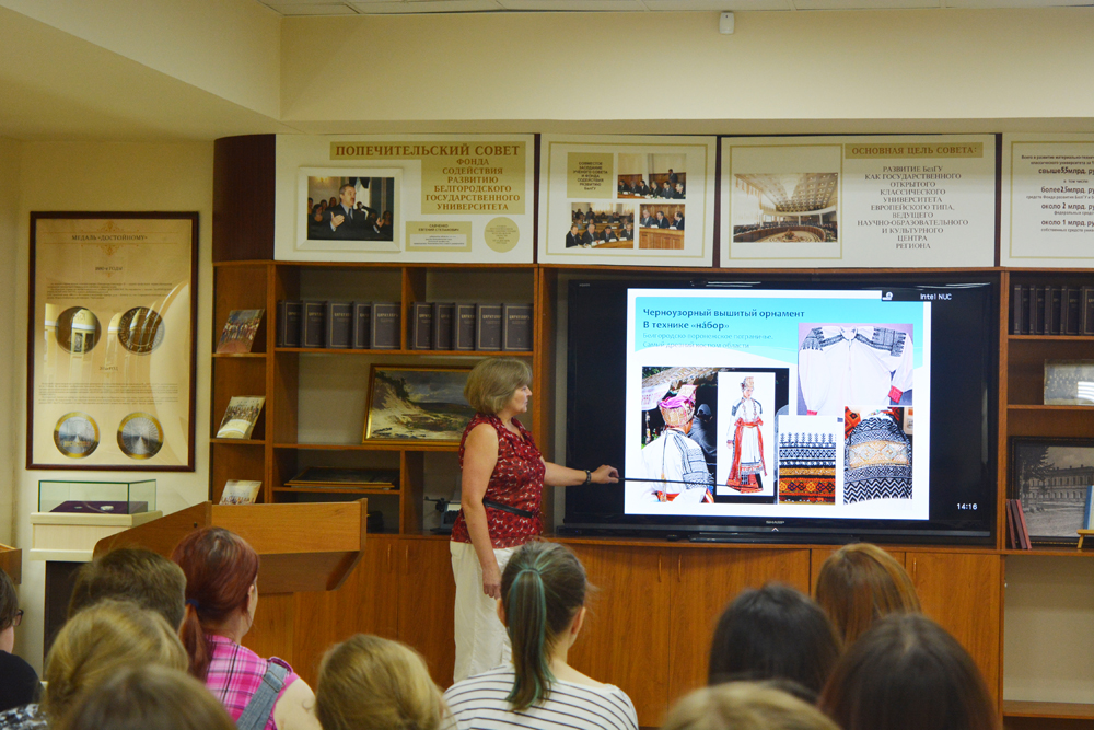 Выпускница НИУ «БелГУ», кандидат философских наук Ирина Шведова, выступившая консультантом выставочного проекта «Скрыня» и оказавшая содействие в атрибуции рушников, рассказала слушателям о символах в культуре славянских народов, видах орнаментов и их значении на разных видах изделий – рубахах, рушниках, набожниках.