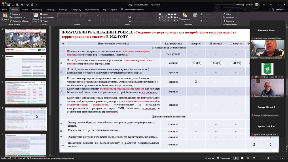 В ходе заседания участники рассказали о целях, задачах, количественных показателях, уникальных результатах и реализации своих проектов. С докладами выступили: руководитель проекта «Создание экспертного центра по проблемам воспроизводства территориальных систем», руководитель научно-исследовательской лаборатории развития гражданского общества Александр Гармашев, руководитель проекта «Создание центра проектных компетенций НКО» в рамках кластера «Создание социальных экосистем территорий», исполнительный директор Высшей школы управления НИУ «БелГУ» Наталья Говоруха, руководитель проекта «Создание студенческого преакселератора на базе школы проектного управления "Пегас"» в рамках кластера «Университет, открытый городу», заместитель директора Высшей школы управления Максим Семибратский и руководитель проекта «Развитие креативных пространств в молодёжной среде» в рамках кластера «Университет, открытый городу», директор департамента информационной политики аппарата ректора Вероника Смирнова.