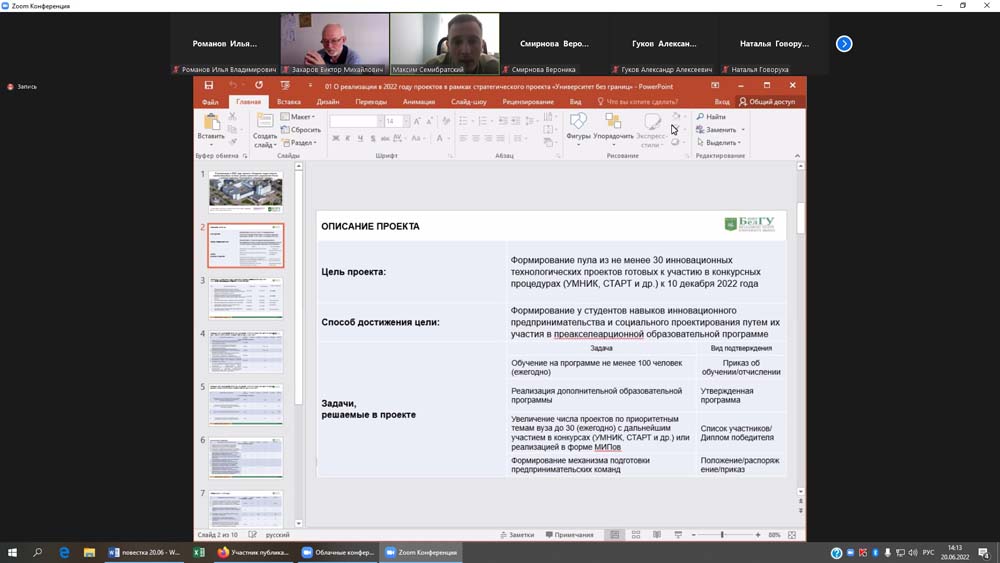 С предварительными итогами деятельности платформы «Университет без границ» за первое полугодие 2022 года присутствующих ознакомил сопредседатель совета, директор института экономики и управления НИУ «БелГУ» Виктор Захаров. Виктор Михайлович напомнил о формировании консорциума «Открытый университет: новые социокультурные практики и коммуникации», который в настоящее время насчитывает 14 участников, а также пожелал всем руководителям проектов дальнейших успехов в их реализации.