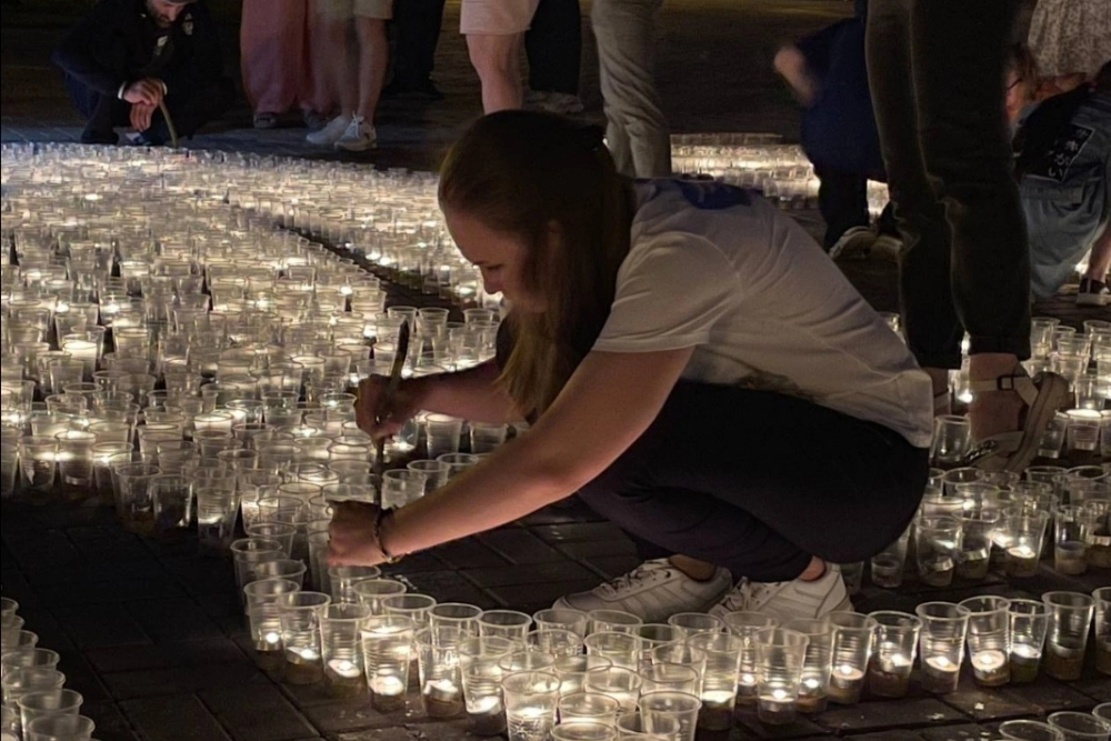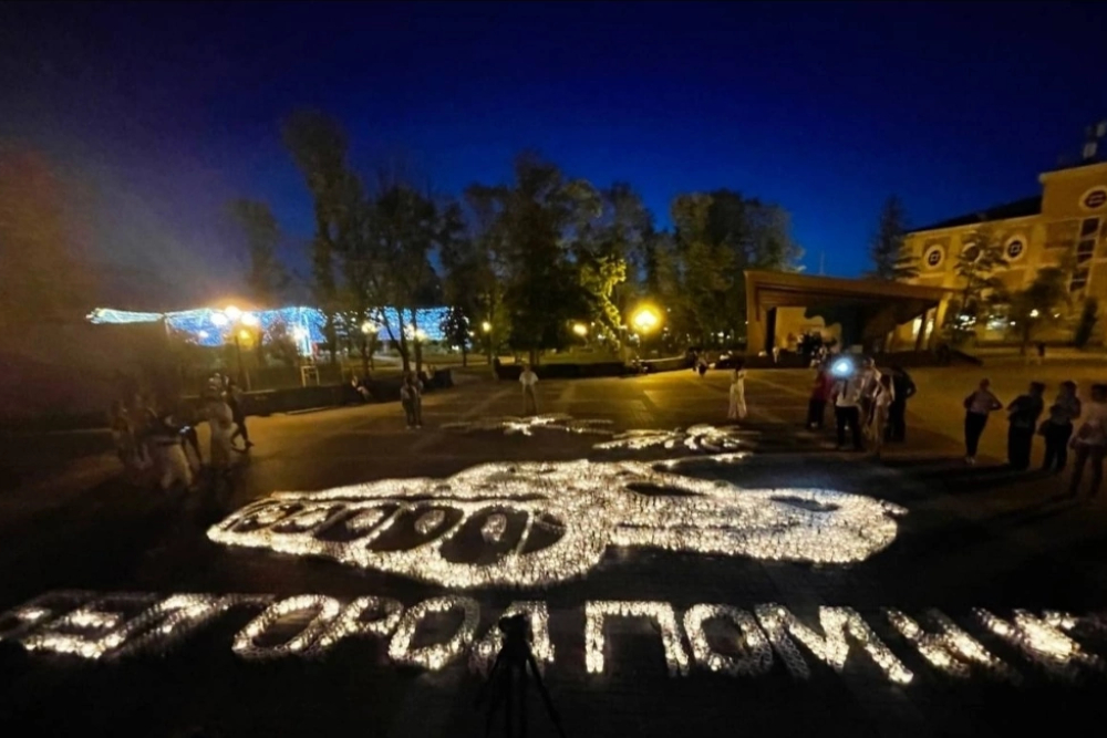 В Парке Победы волонтёры вместе с другими участниками акции выложили из множества горящих свечей образ-контур будущей картины – танк Т-34.