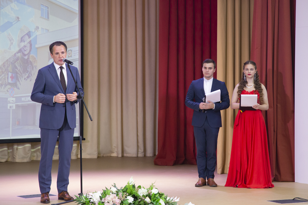 Глава региона Вячеслав Гладков отметил высокий уровень оснащения учебных классов медицинского колледжа и подчеркнул, что к качественному обучению здесь прикладывается ещё воспитание настоящего человека, настоящего гражданина, патриота своей Родины. Губернатор также выразил надежду, что, выстраивая системную работу по подготовке медработников, Белгородская область не только сможет избежать кадровых проблем, но и в ближайшем будущем обеспечит конкурс на каждое место в системе здравоохранения. Вячеслав Владимирович вручил благодарственное письмо коллективу колледжа и нагрудный знак «Почётный работник сферы образования Российской Федерации» директору колледжа Галине Дегальцевой.