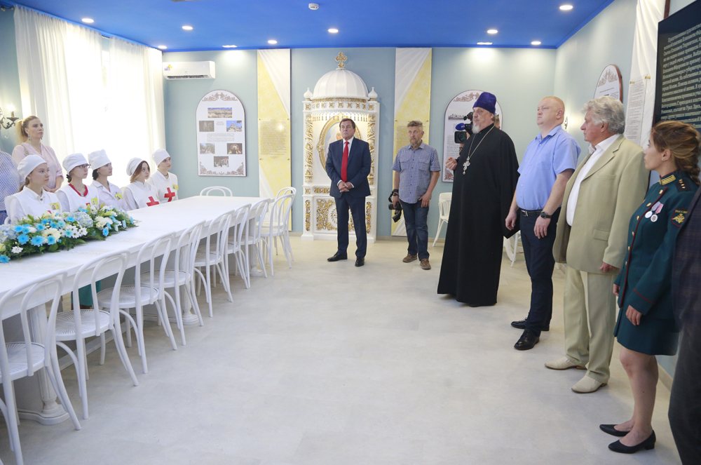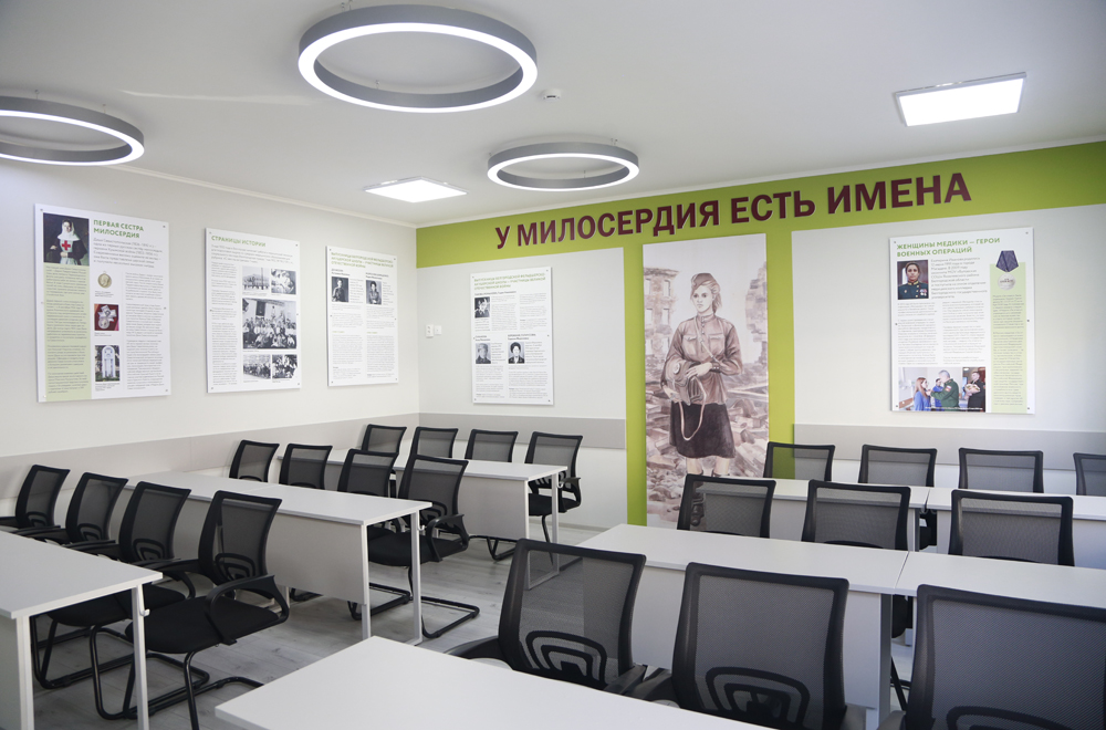 Гости также ознакомились с экспозицией Зала Памяти и Славы медицинских работников. Аудитория посвящена примерам массового героизма, мужества, стойкости, которые запомнила история нашей страны. В ней рассказывается о Даше Севастопольской, прославившейся в народе как одна из самых первых военных сестёр милосердия. Также в Зале Памяти и Славы медицинских работников отражена благодарность выпускникам медицинского колледжа – военным медикам: Антонине Денисовой, Марии Морозовой, Лидии Львовой, Анне Сухановой, Евдокии Бережной. А в качестве героического примера храбрости и мужества российских военных в освобождении Донбасса здесь установлен стенд о присутствовавшей на церемонии открытия выпускнице колледжа, фельдшере Екатерине Ивановой.