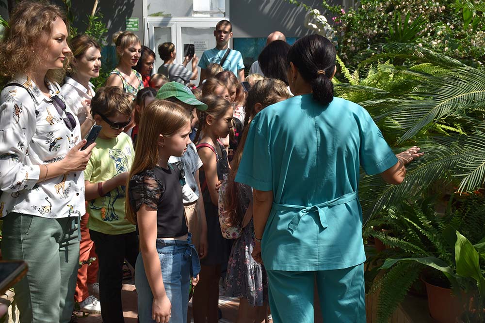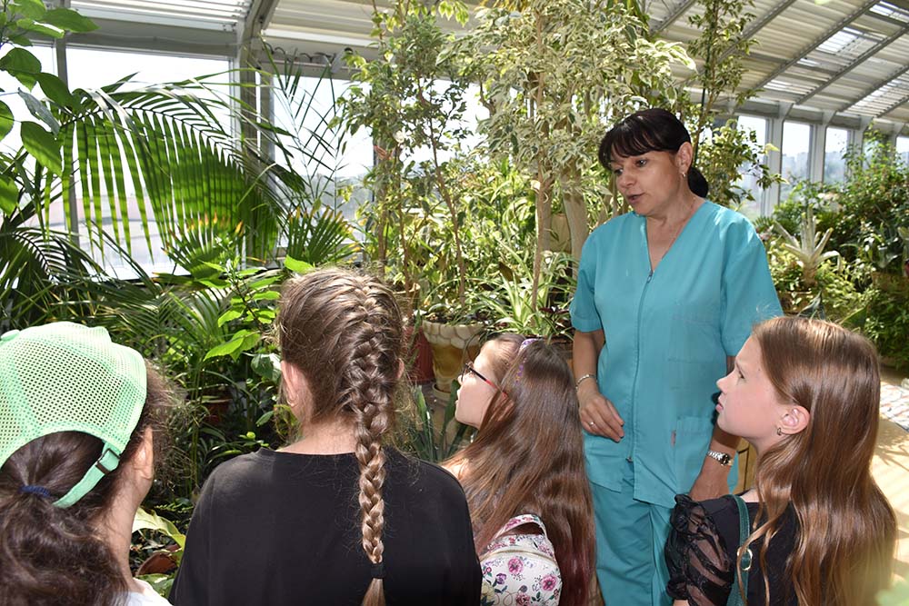 В зимнем саду юные гости узнали много интересного об экзотических растениях, произрастающих в разных уголках планеты. Заведующая зимним садом Ирина Архипова показала детям цветущий банан и рассказала, что его ошибочно называют фруктом.
