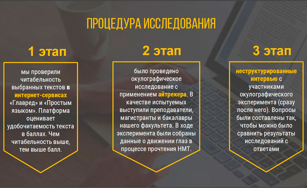 – Мне очень понравилась новая форма коммуникации с людьми сквозь призму восприятия того, как и куда они смотрят, читая текст. Кроме проведения самого исследования, было просто интересно разобраться, как работает довольно сложное и относительно новое оборудование для отслеживания взгляда: от фиксации зон внимания до указания направления взгляда и «слепых» зон, – пояснила студентка.