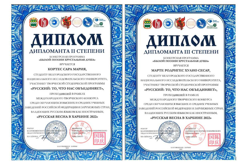 Слушатели подготовительного факультета и студенты медицинского института НИУ «БелГУ» приняли участие в международном творческом конкурсе «Русская весна в Харбине 2022» среди обучающихся высших и средних учебных заведений РФ и зарубежных стран, изучающих русский язык как иностранный. Всего в конкурсе участвовали 76 образовательных организаций из 28 стран мира.