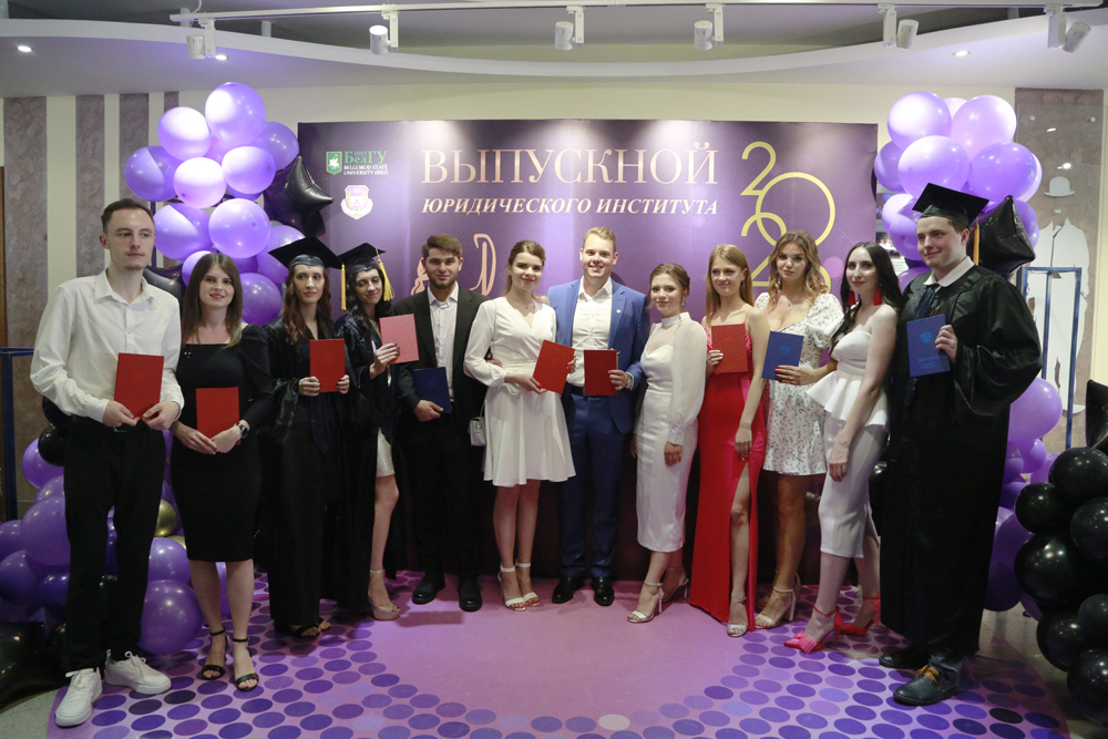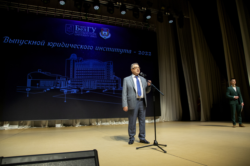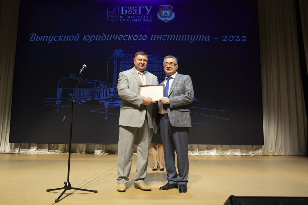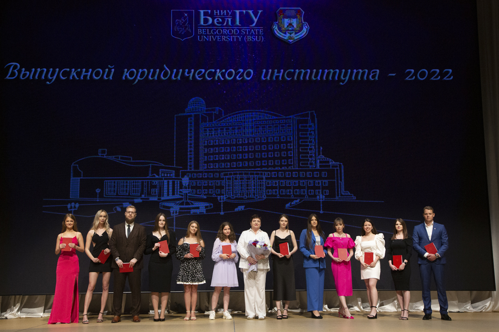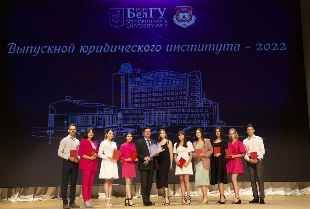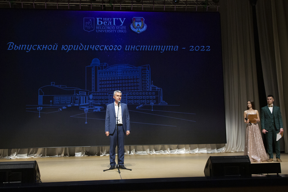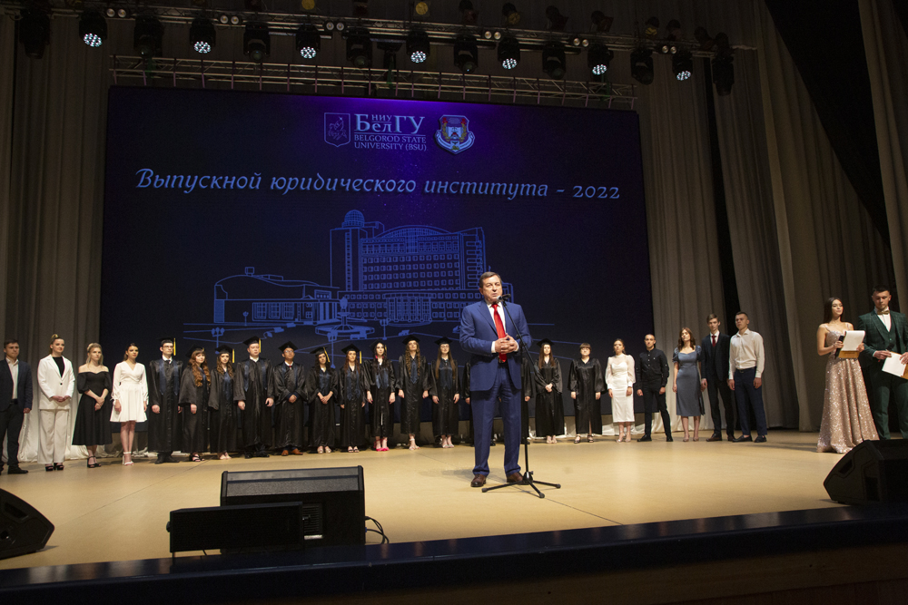 Торжественная церемония вручения дипломов выпускникам юридического института НИУ «БелГУ» прошла в Молодёжном культурном центре вуза. Поздравить выпускников со вступлением во взрослую профессиональную жизнь пришли ректор вуза, профессор Олег Полухин, директор юридического института, профессор Евгений Тонков, научный руководитель юридического института НИУ «БелГУ», член-корреспондент РАН, и.о. зав. сектором гражданского и предпринимательского права ИГП РАН Андрей Габов, главный федеральный инспектор по Белгородской области аппарата полномочного представителя Президента РФ в ЦФО Ольга Кремнёва, первый заместитель председателя Белгородской областной Думы Любовь Киреева, а также представители структур и ведомств, где сегодня трудятся выпускники прежних лет, – председатель Белгородского областного суда Олег Усков, прокурор Белгородской области Владимир Торговченков, заместитель начальника УМВД России по Белгородской области – начальник следственного управления Юрий Баранов, и. о. председателя Арбитражного суда Белгородской области Валентина Белоусова, начальник УМВД России по городу Белгороду Александр Коробейников, начальник управления Министерства юстиции РФ по Белгородской области Александр Черепанов, заместитель руководителя следственного управления Следственного комитета России по Белгородской области Василий Ларин, заместитель руководителя управления Федеральной службы судебных приставов по Белгородской области Елена Чанышева, президент Белгородской областной нотариальной палаты Ирина Суязова.
