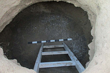 Еще одна интересная находка сделана с внешней стороны восточной стены помещения № 12. Там была обнаружена сохранившаяся пустая зерновая яма. Яма грушевидной формы была сооружена в материке в глубину на 1,8 м. Диаметр ямы в средней части составлял около 1,5 м. Яма была перекрыта тонкой крышкой из ракушечника. Тот факт, что сооружение было обнаружено пустым, позволило руководителю археологических работ на памятнике А.А. Супренкову предположить её использование в качестве места накопления и хранения зерновых.