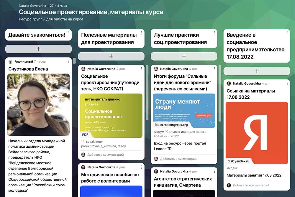 Наталья Сергеевна также отметила, что личное знакомство, создание новых деловых и творческих связей не менее полезны для выпускников, чем знания и навыки. А важным результатом курса «Социальное проектирование» станут заявки участников на различные грантовые конкурсы.