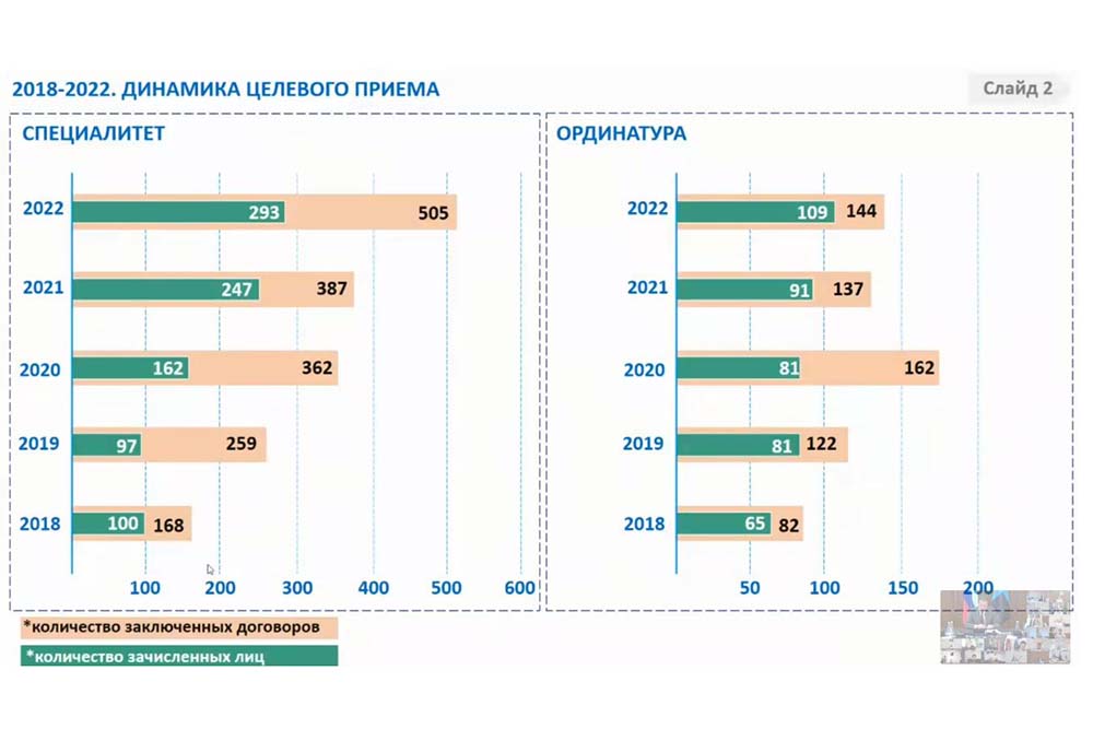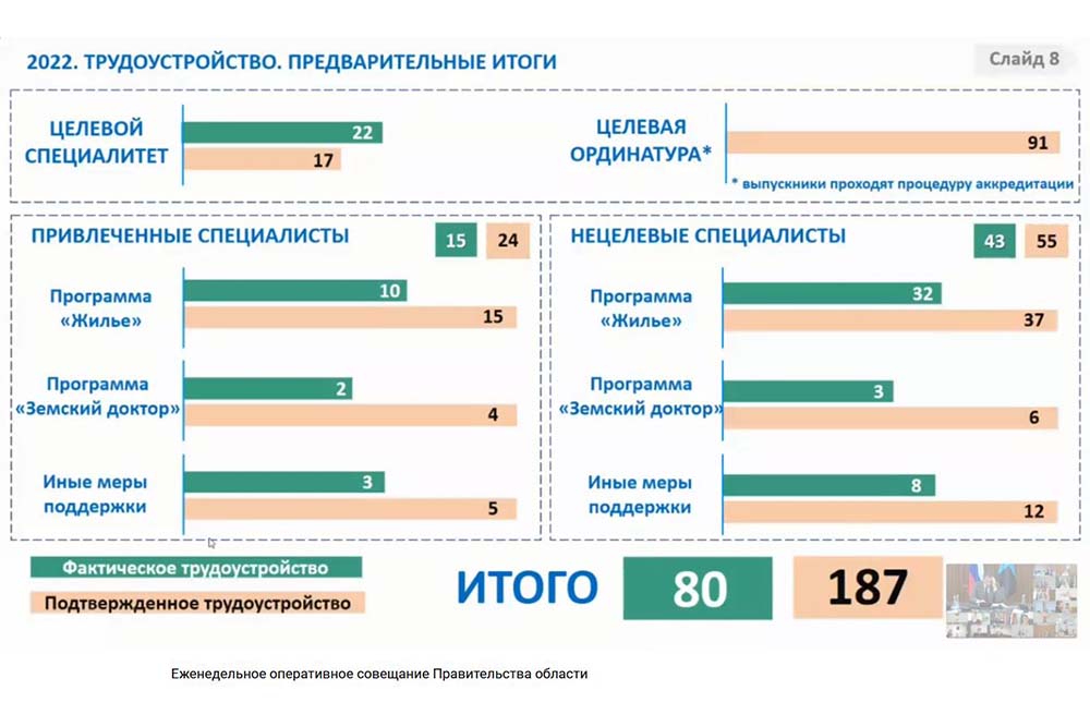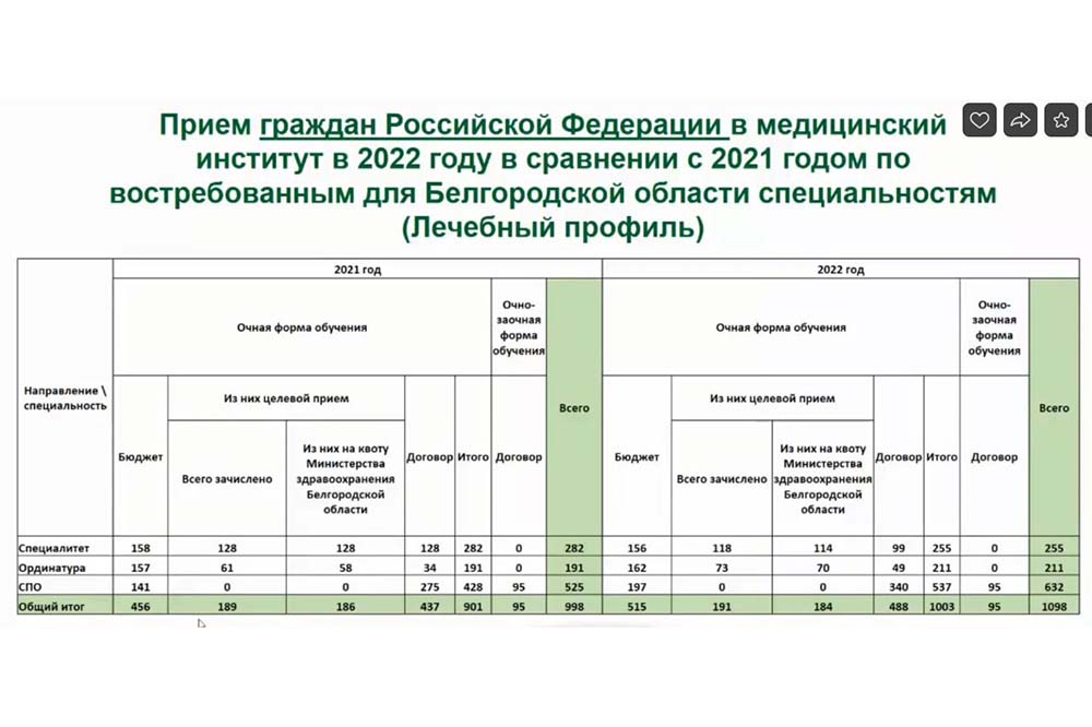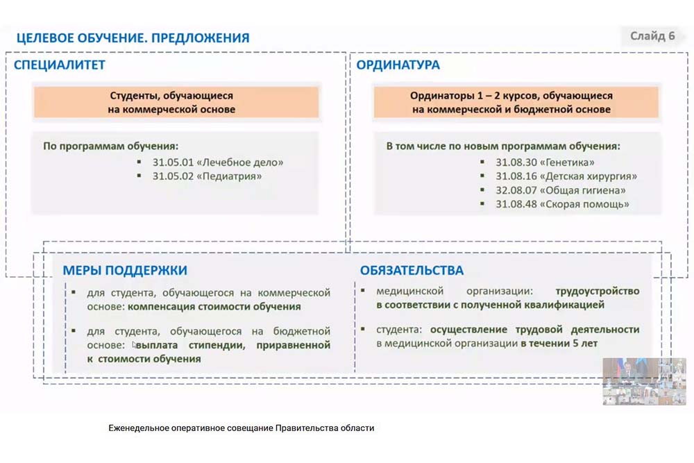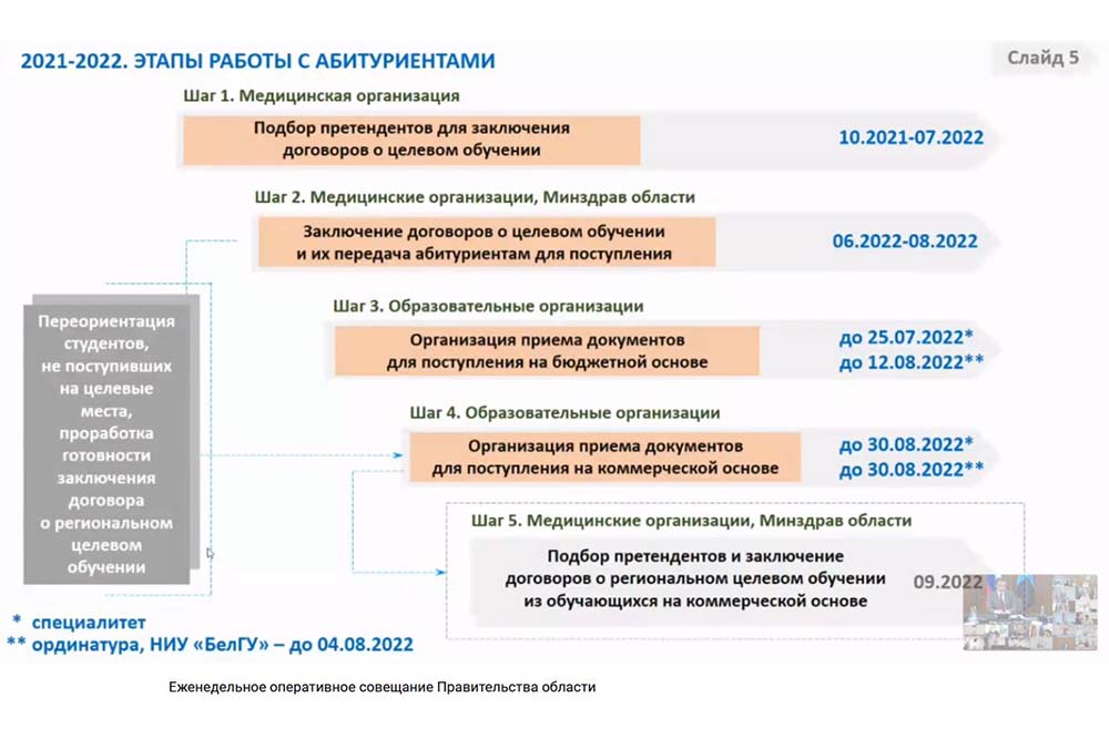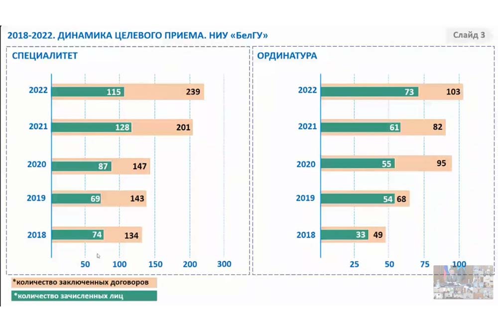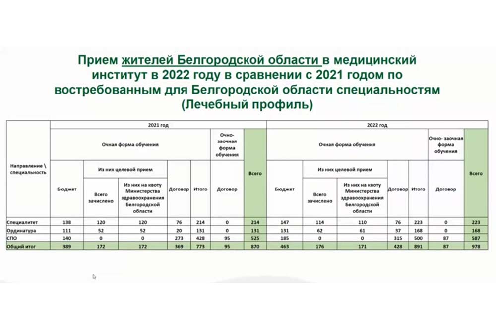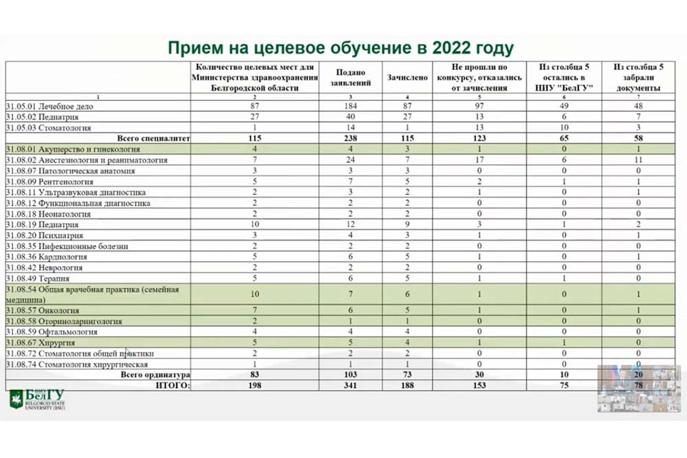 Министр здравоохранения региона Андрей Иконников доложил о ситуации с целевым набором, отметив, что на данный момент в Белгородский госуниверситет поступили 115 целевиков на специалитет и 73 – в ординатуру. Остальные абитуриенты-целевики (214 человек) приняты в профильные вузы Курска, Воронежа и Москвы.