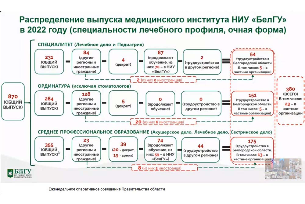 Вопросы целевого набора в медицинский институт НИУ «БелГУ», а также последующего трудоустройства выпускников обсудили на оперативном совещании в Правительстве Белгородской области под руководством губернатора Вячеслава Гладкова. Глава региона поставил задачу – в максимально сжатые сроки устранить имеющийся дефицит медицинских кадров (в регионе 99 вакансий только участковых терапевтов и 27 – участковых педиатров) и прежде всего за счёт выпускников НИУ «БелГУ».