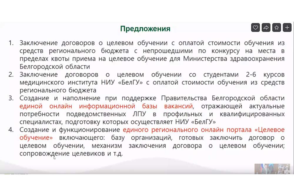 На оперативном совещании в Правительстве области ректор НИУ «БелГУ» Олег Полухин высказал ряд предложений, направленных на устранение дефицита медицинских кадров.