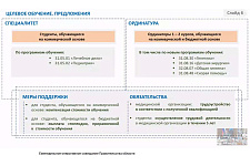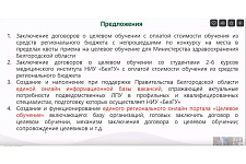 В числе озвученных на совещании мер, которые университет предлагает для устранения дефицита медицинских кадров, – заключение договоров с оплатой из регионального бюджета с абитуриентами, не прошедшими на места в пределах квоты на целевое обучение (вуз готов принять дополнительно 65 человек на специалитет и не менее 10 – в ординатуру), так и со студентами 2-6 курсов, которые намеревались поступить на целевое обучение в предыдущие годы. Важное значение для решения проблемы, по мнению ректора, имеет формирование единой информационной онлайн-базы вакансий, отражающей актуальные потребности лечебно-профилактических учреждений в профильных специалистах, подготовку которых осуществляет НИУ «БелГУ». Университет готов помочь в её создании. Также речь шла о разработке единого регионального онлайн-портала «Целевое обучение» с базой организаций, готовых заключить договор о целевом обучении, механизмом заключения договоров о целевом обучении и сопровождения целевиков вплоть до трудоустройства.