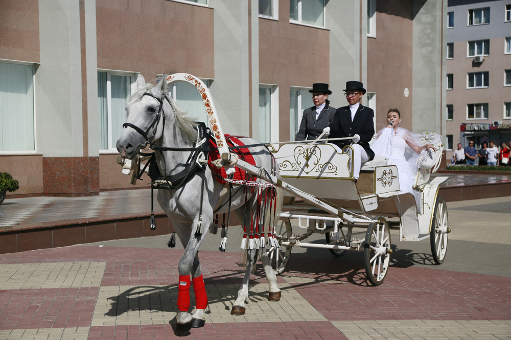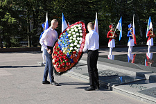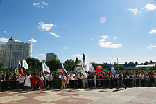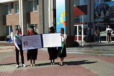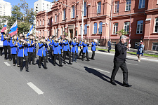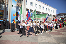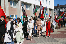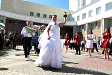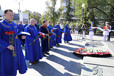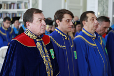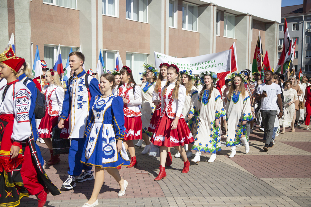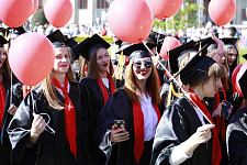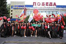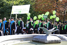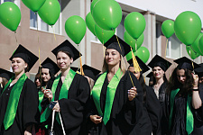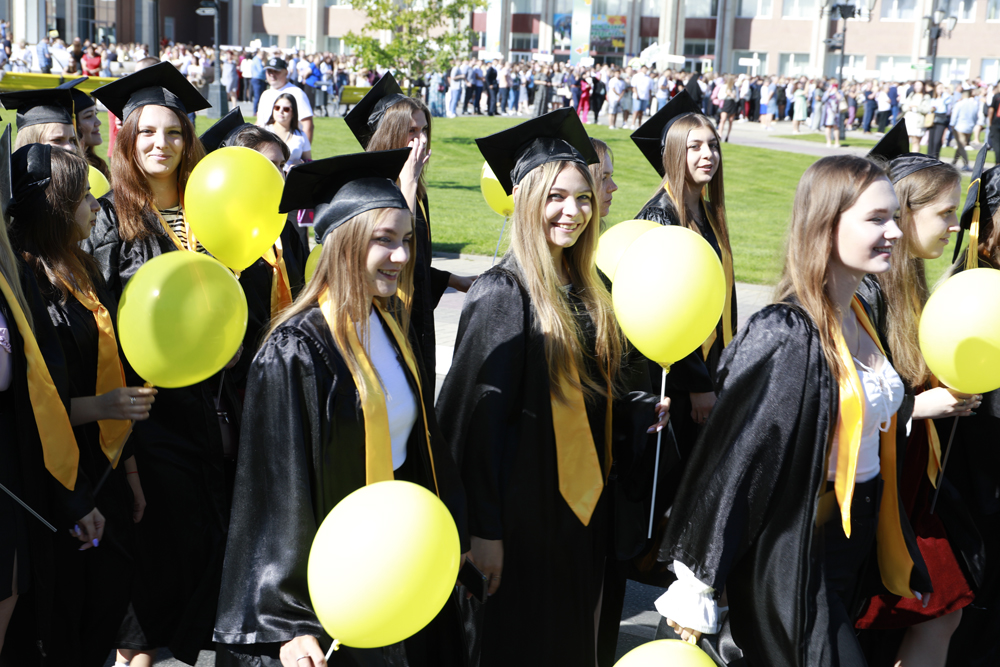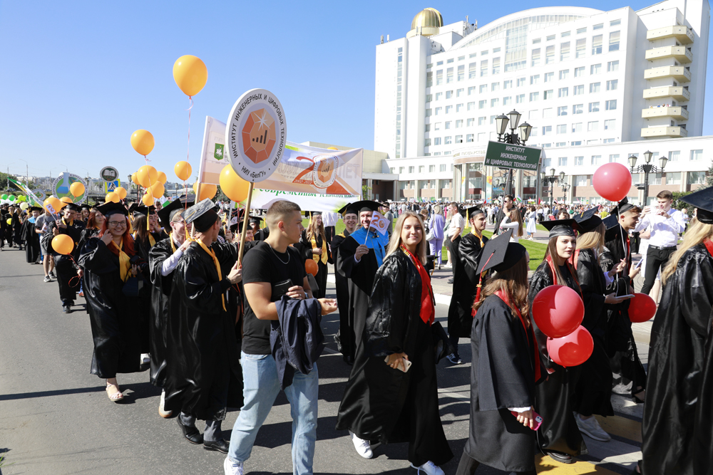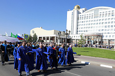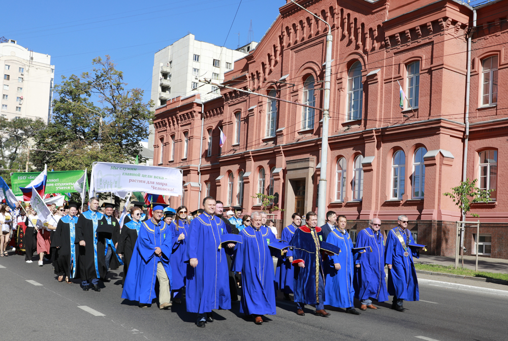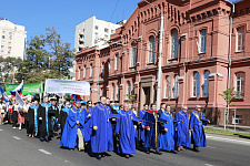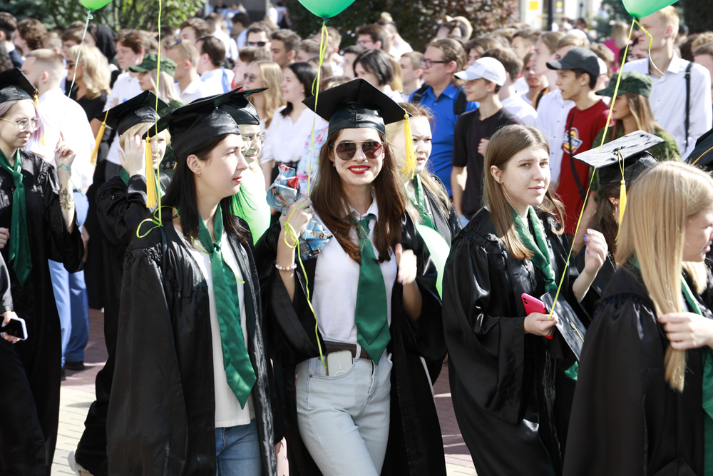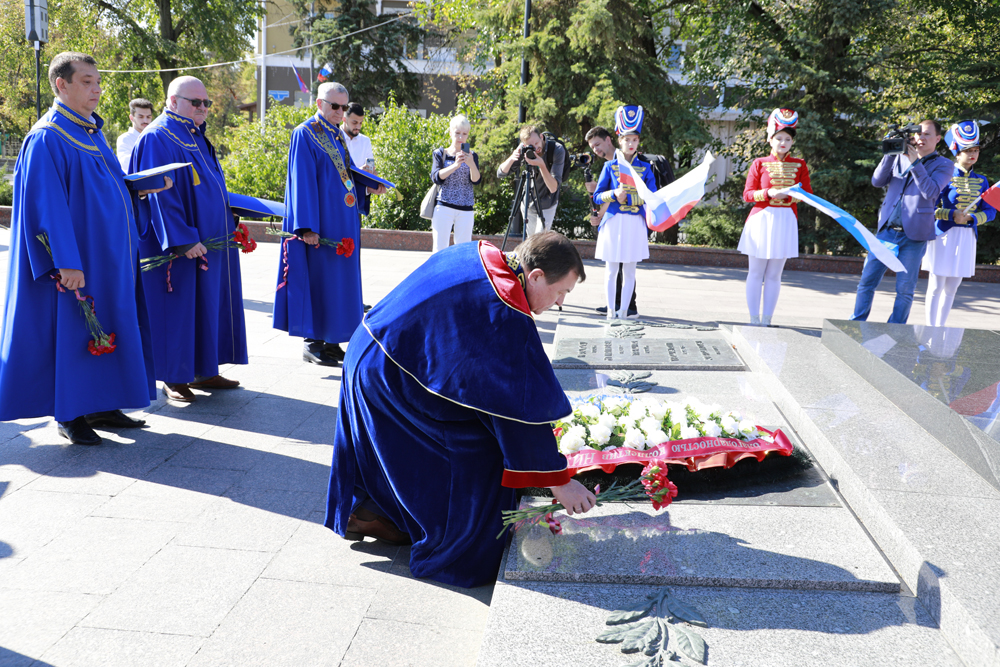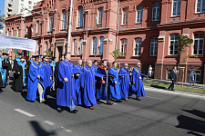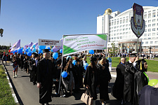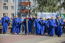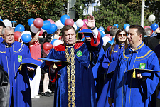 Празднование продолжилось самой яркой традицией университета – академическим шествием по центру города членов учёного совета и студентов выпускных курсов. Участники шествия сделали остановку у мемориального комплекса «Скорбящая мать» и возложили к памятнику венки и цветы.
