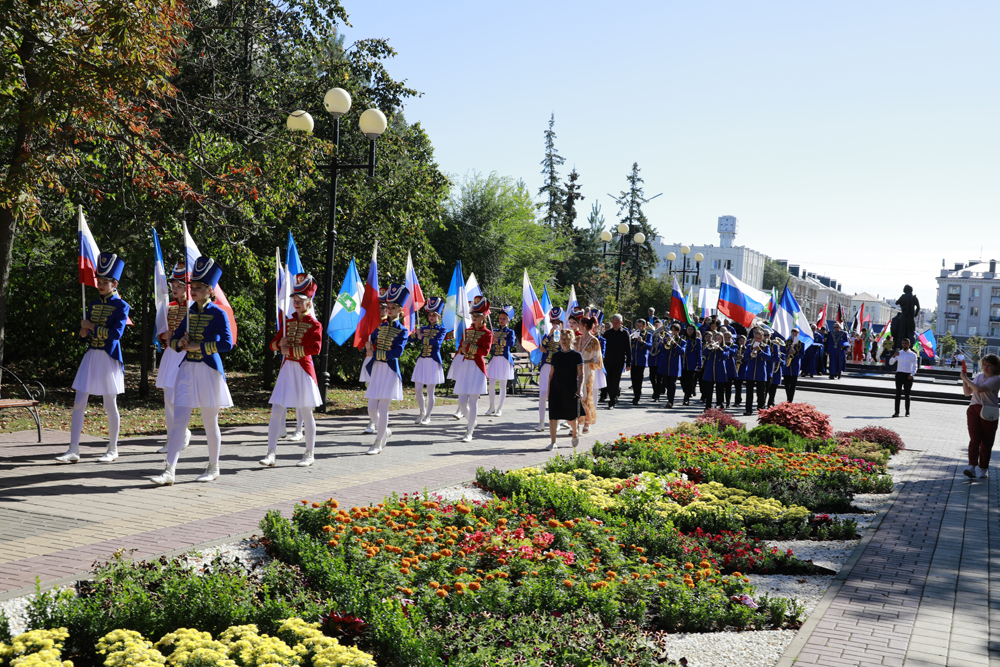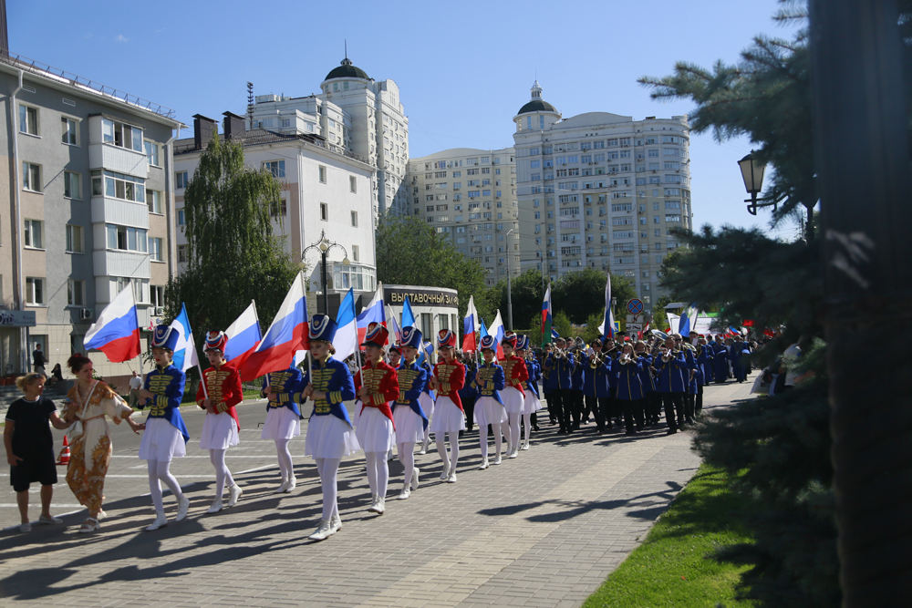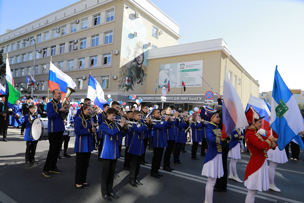 Началом линейки в честь Дня знаний стал торжественный вход шествия на университетскую площадь под аккомпанемент ректорского духового оркестра, которому 29 августа исполнилось 20 лет. Процессию возглавили две группы флагоносцев и члены учёного совета НИУ «БелГУ», за ними следовали представители институтов и факультетов, студенческих объединений и творческих коллективов.