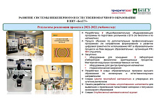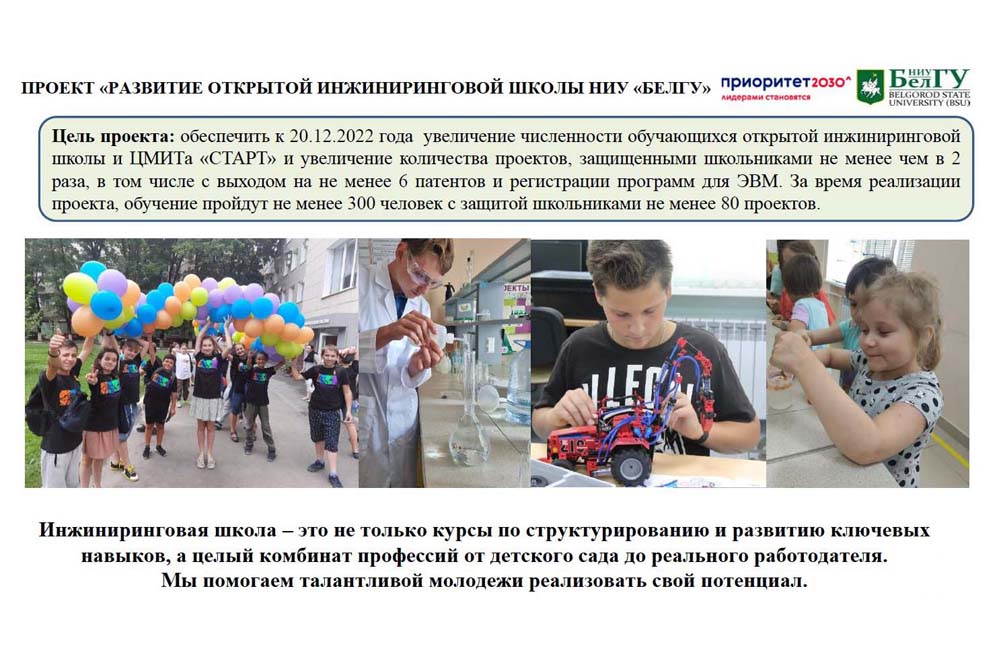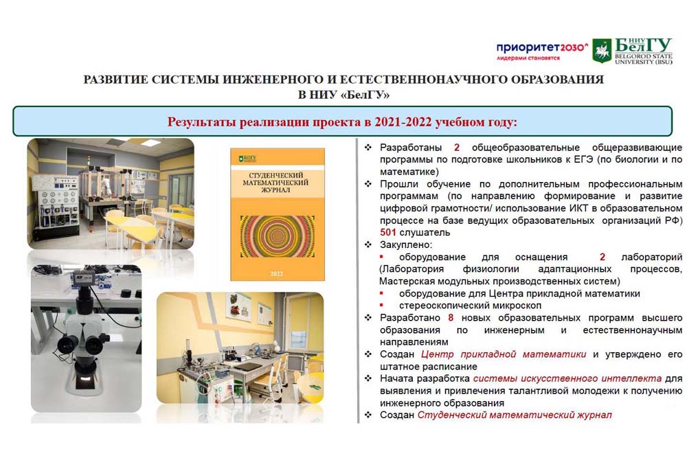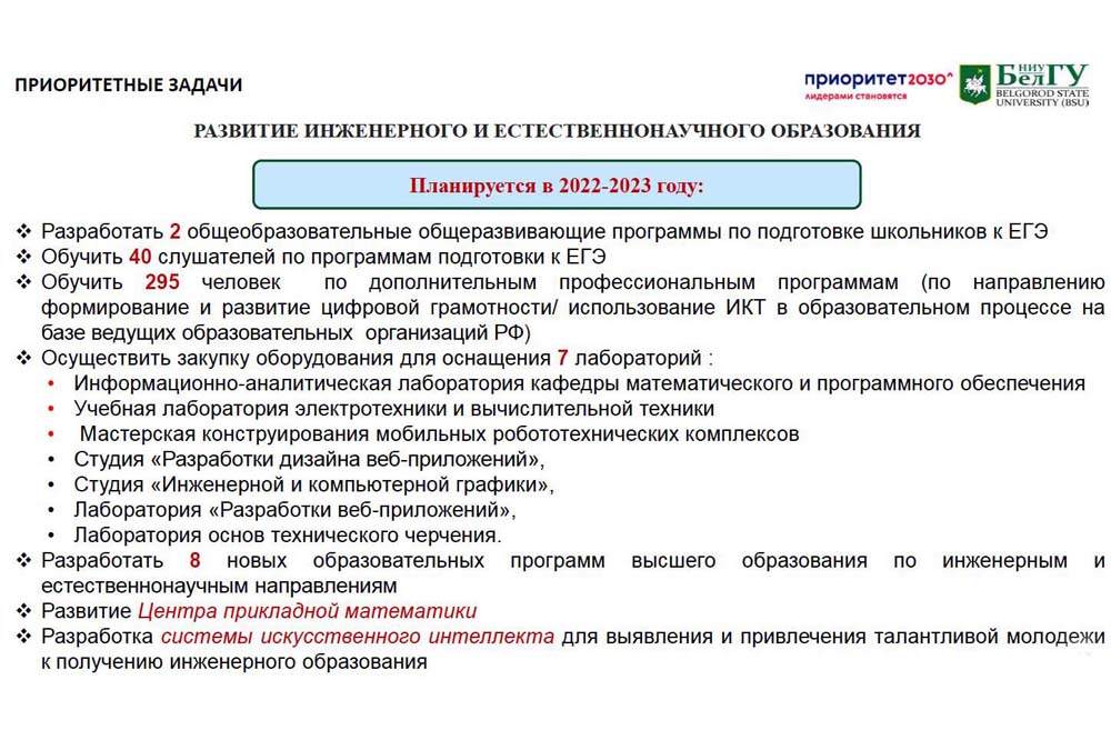 В рамках проекта «Развитие системы инженерного и естественнонаучного образования в НИУ «БелГУ»» в вузе реализуется три подпроекта: развитие инженерного и естественнонаучного образования; разработка системы искусственного интеллекта для выявления и привлечения талантливой молодёжи к получению инженерного образования; создание Центра прикладной математики. В настоящий момент разрабатываются новые образовательные программы, закупается оборудование для оснащения новых учебных лабораторий и мастерских, ведётся активная работа по вовлечению в научную деятельность студентов.
