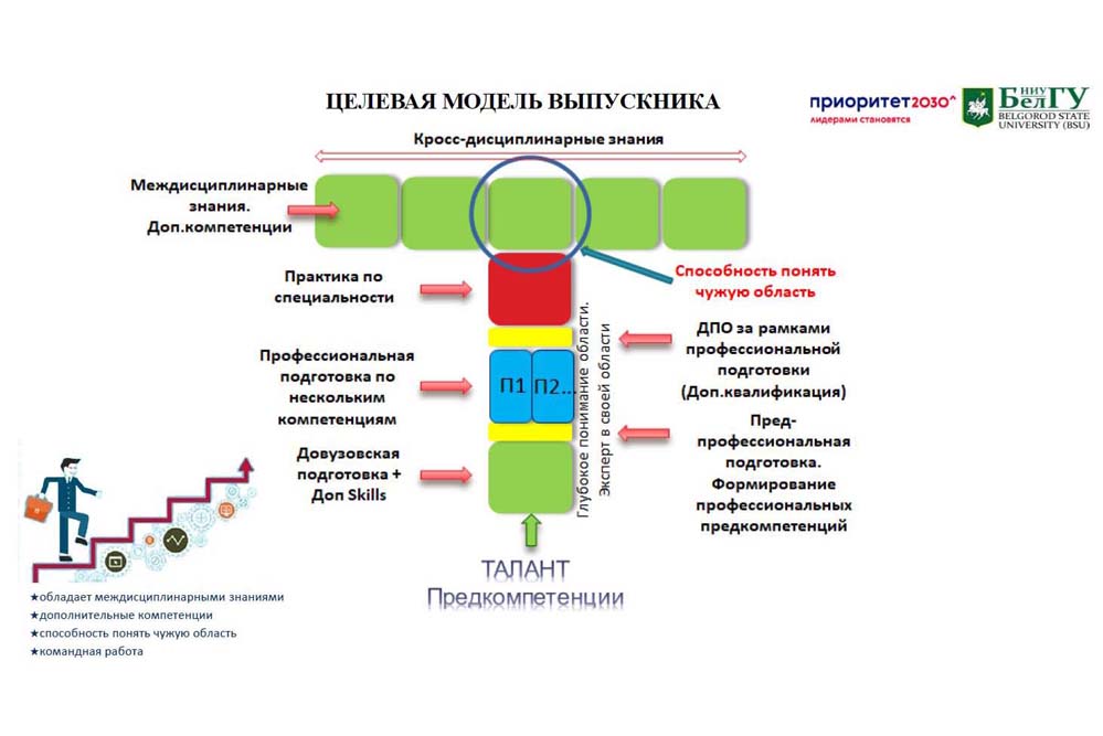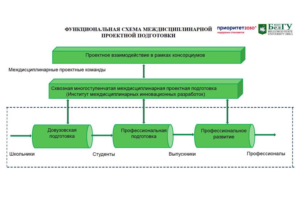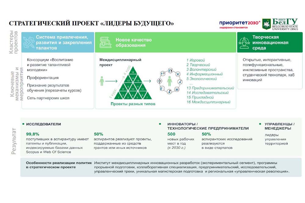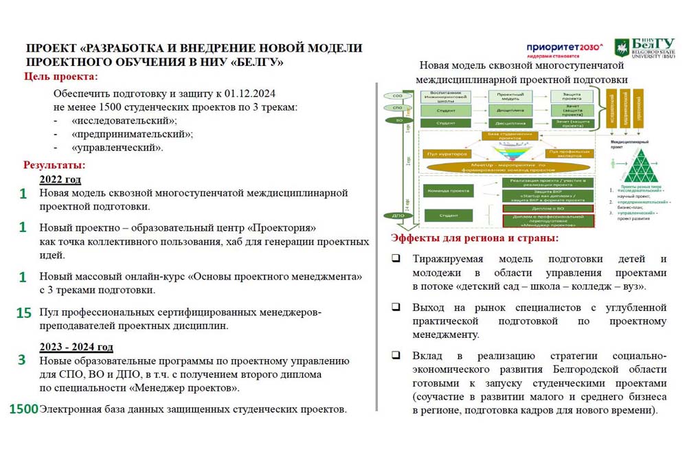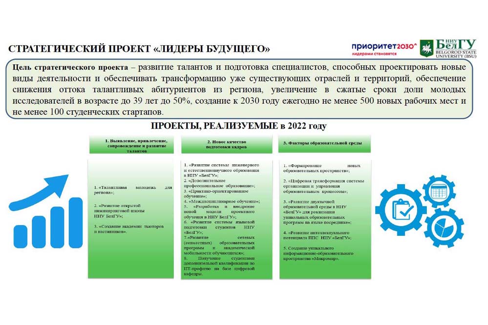 Для выявления и привлечения одарённых молодых людей в вуз реализуется проект «Талантливая молодёжь – для региона», предполагающая целый комплекс профориентационных мероприятий. Выстраивается новая модель сквозной междисциплинарной проектной подготовки школьников во взаимодействии «Школа – ДПО – вуз – работодатель» (проект «Развитие открытой инжиниринговой школы НИУ «БелГУ»). В самом университете внедряется новая модель проектного обучения (проект «Разработка и внедрение новой модели проектного обучения в НИУ«БелГУ»). В образовательные программы включены дисциплины, обеспечивающие подготовку по исследовательскому, предпринимательскому и управленческому трекам. Создано проектно-образовательное пространство «Проектория», в целом до конца 2022 года будет создано 32 новых образовательных пространства. К 2023/2024 учебному году будут разработаны новые образовательные программы по проектному управлению для среднего профессионального, высшего и дополнительного образования с получением второго диплома по специальности «Менеджер проектов».