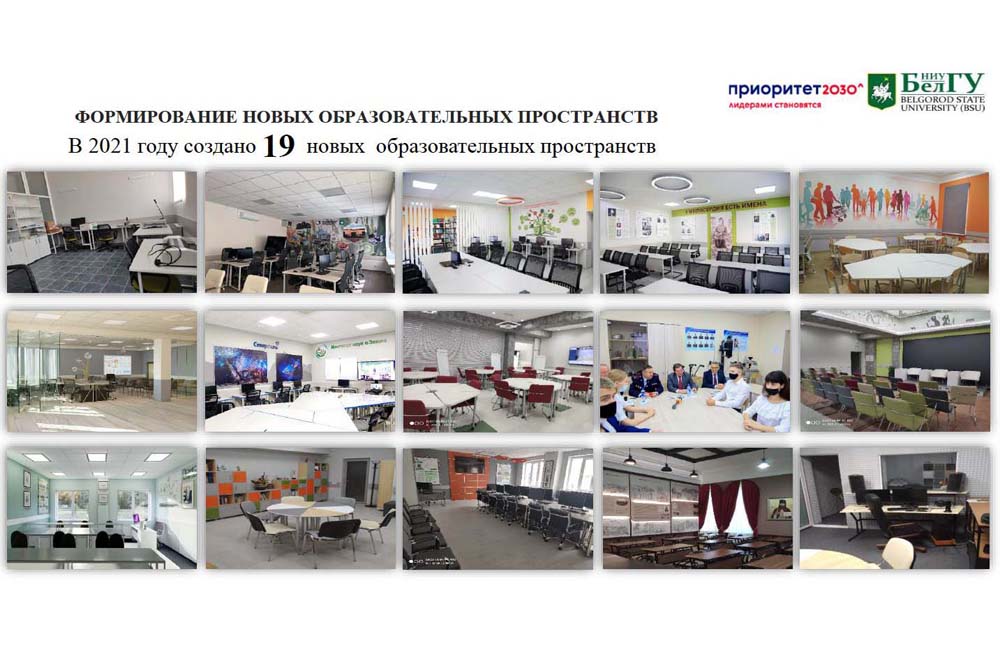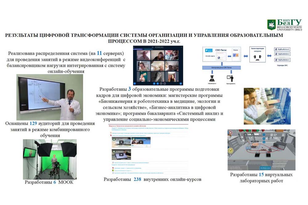 Для повышения доступности основных и дополнительных образовательных программ НИУ «БелГУ» в 2021/22 учебном году в вузе сформирована аппаратно-программная платформа видеоконференцсвязи на основе сервиса BigBlueButton, включающая 11 серверов с сервером-балансировщиком нагрузки, оборудовано 129 специализированных аудиторий. Ещё 65 аудиторий будут оснащены мультимедийным оборудованием в нынешнем учебном году.