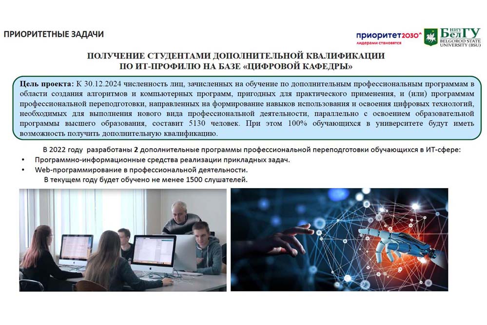 Руководитель стратпроекта «Лидеры будущего» сделал акцент на создании «цифровой кафедры», обучение по двум дополнительным программам профессиональной переподготовки в ИТ-сфере (Программно-информационные средства реализации прикладных задач и Web-программирование) должны пройти не менее 1500 студентов, чьи основные направления подготовки не связаны с информационными технологиями.