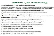 В течение года разработаны три образовательные программы для цифровой экономики, ещё три запланированы на 2022/23 учебный год. Также планируется разработать семь массовых открытых онлайн-курсов, 350 внутренних онлайн-курсов для системы электронного обучения «Пегас» и 15 виртуальных лабораторных работ.