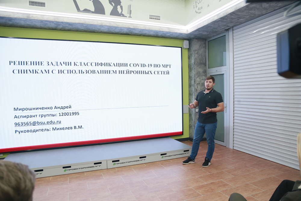 Перед участниками выступили шесть спикеров. Молодые люди являются обучающимися ИИиЦТ и уже успешно внедряют свои проекты в разные сферы жизни региона. Так, Андрей Мирошниченко представил нейросеть, обученную распознавать признаки COVID-19 по МРТ-снимкам пациентов.