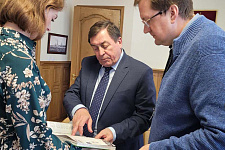 Ректор НИУ «БелГУ» Олег Полухин поблагодарил Ивана Ожгихина за столь символичный и ценный подарок и вручил в ответ обновлённое издание книги «Старт в профессию», которая рассказывает об именных и тематических аудиториях университета, в том числе трёх, открывшихся к юбилею на площадке медицинского колледжа и двух новых пространствах, открытых в вузе 23 сентября – аудитории «Русская философия: великие имена» и учебном полигоне для подготовки горных инженеров «Шахта».