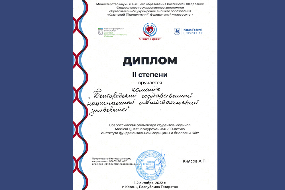Обучающиеся НИУ «БелГУ» заняли второе место во Всероссийской олимпиаде студентов-медиков Medical Quest, приуроченной к 10-летию института фундаментальной медицины и биологии Казанского федерального университета.