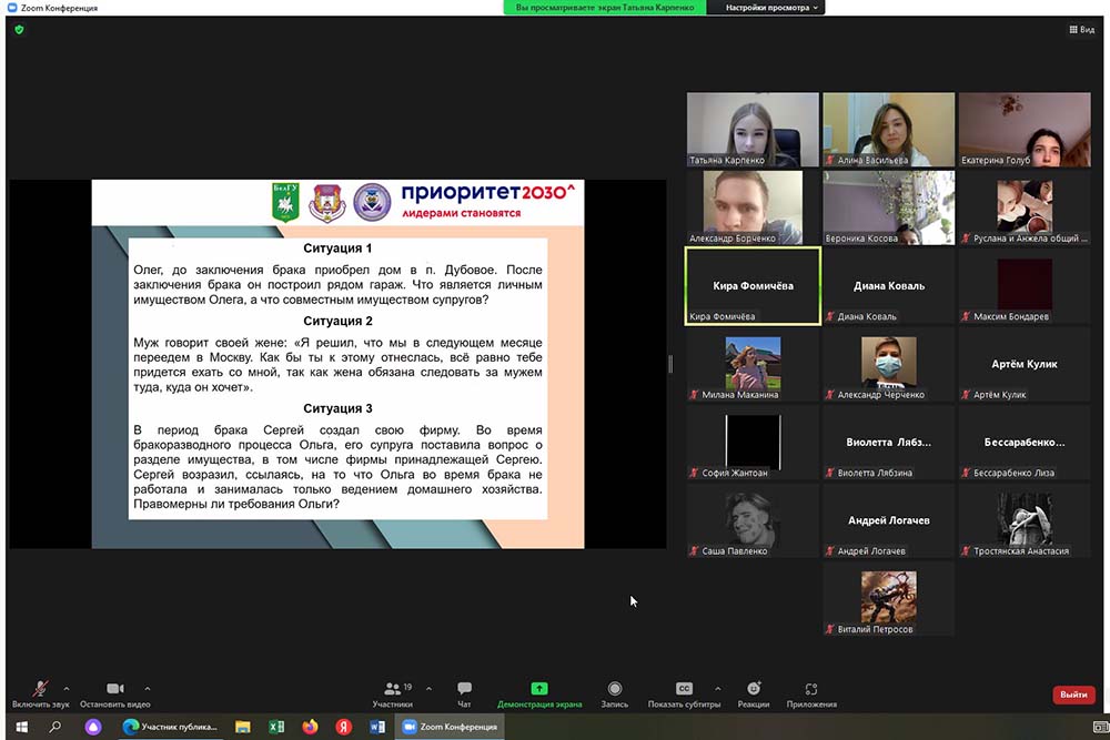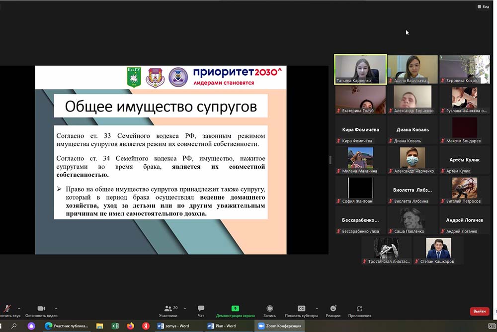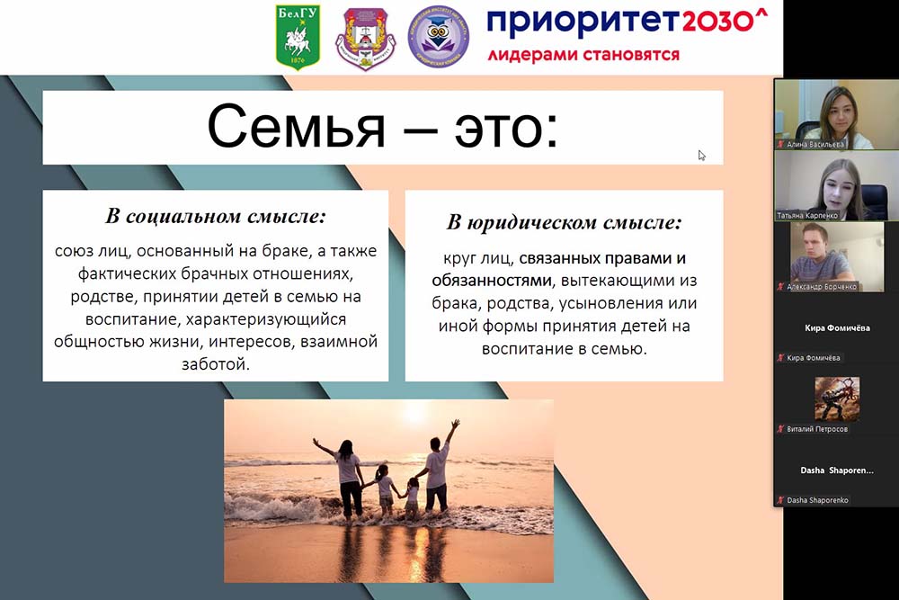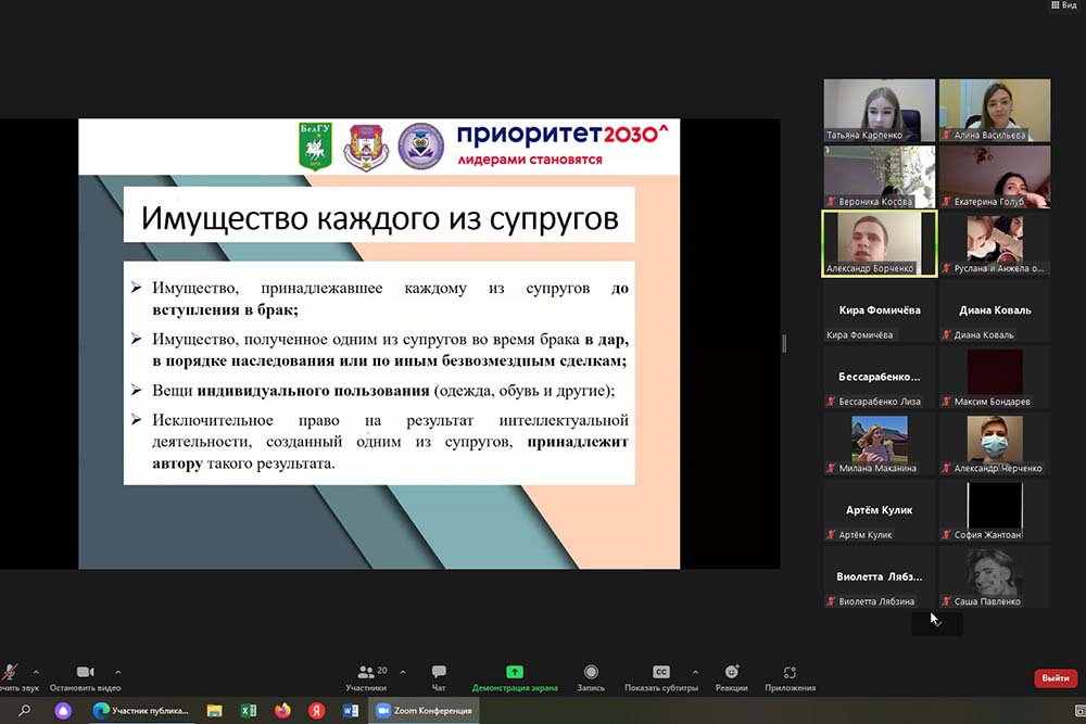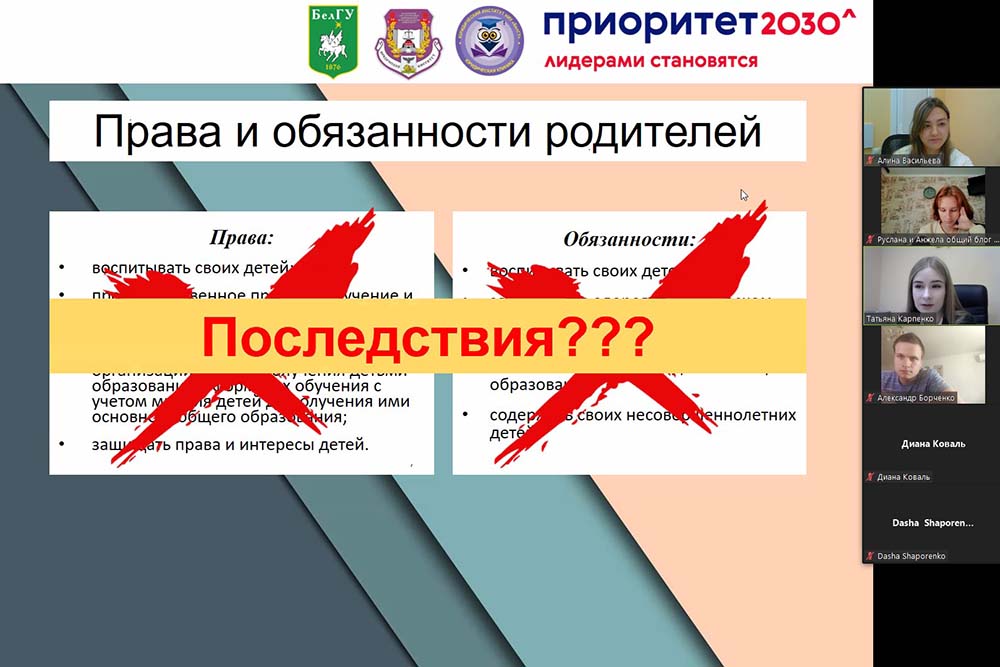 На площадке центра правового просвещения несовершеннолетних «ЮНИОР» юридического института НИУ «БелГУ» состоялась онлайн-встреча с учениками 11 класса белгородской МБОУ «СОШ №40» на тему «Семейные правоотношения».