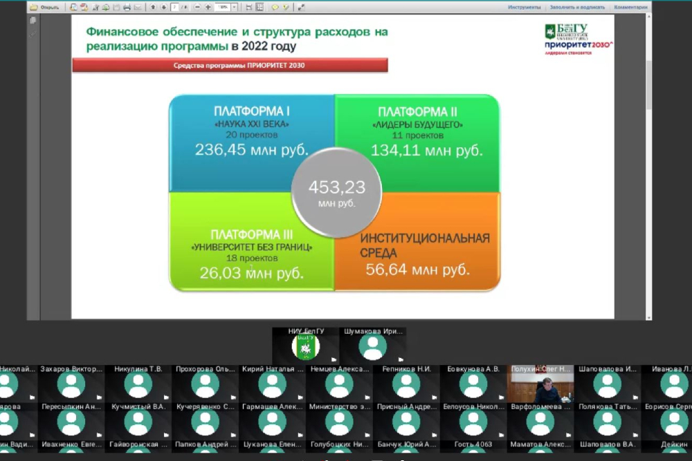 О финансовой поддержке в 2022 году из средств федерального и регионального бюджетов проектов, реализуемых в вузе по программе «Приоритет-2030», членам управляющего совета по реализации программ стратегического развития НИУ «БелГУ» под руководством ректора, профессора Олега Полухина рассказал проректор по экономике и финансам Игорь Полевой. О промежуточных результатах самих 57 проектов, включенных в программный портфель «Приоритет-2030», доложили руководитель проектного офиса аппарата ректора Светлана Гайворонская и руководители платформ: «Наука XXI века» – проректор по науке и инновациям Николай Репников, «Лидеры будущего» – проректор по образовательной деятельности Александр Маматов и «Университет без границ» – проректор по воспитательной работе и молодёжной политике Елена Цуканова.