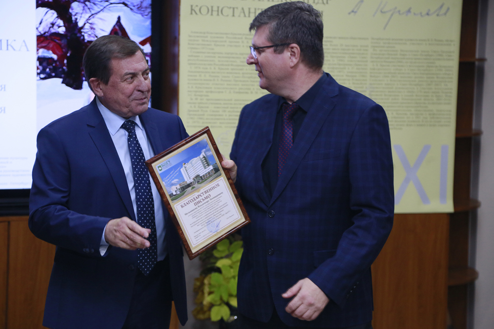 Слова отдельной благодарности коллективу музея были адресованы за приуроченные к юбилею и реализованные в этом году столь важные в сегодняшних реалиях выставочные проекты «Скрыня» и «Два академика», которые, по мнению ректора, объединяют прошлое с настоящим и устремляют нас в будущее.