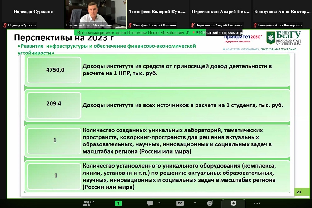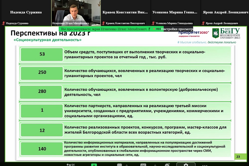 Говоря о приоритетных задачах развития института на 2023 год, Игнат Михайлович подчеркнул, что в образовательной деятельности планируется увеличить количество обучающихся в 1,4 раза, лицензировать 3 новых программы высшего образования, реализовать 4 совместные образовательные программы высшего образования и разработать массовый открытый онлайн-курс. Он также сообщил, что подана заявка на включение еще одного проекта в программу «Приоритет-2030».