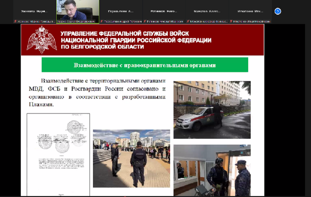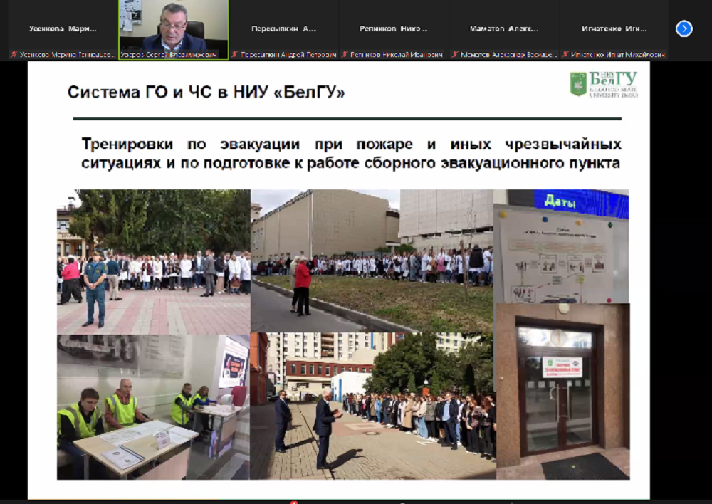 В ходе заседания был также заслушан доклад директора департамента комплексной безопасности Сергея Уварова о состоянии террористической защищённости университета. Сергей Владимирович рассказал о принятых в НИУ «БелГУ» мерах по организации физической охраны объектов, обеспечении круглосуточной охраны, пропускного и внутриобъектного режимов. Охранными организациями созданы две мобильные группы быстрого реагирования, разработан план развития комплексной безопасности университета. разработаны и утверждены инструкции, памятки и алгоритм действий при обнаружении посторонних лиц, при угрозе совершения террористического акта. Проводится обучение и тренировки сотрудников и обучающихся по эвакуации. выступивший содокладчиком представитель территориального органа Федеральной службы войск национальной гвардии РФ по Белгородской области Андрей Бредихин сообщил, что все объекты университета прошли категорирование в 2021 году. В настоящее время в НИУ «БелГУ» обеспечивается непрерывность наблюдения и архивирование с помощью камер наблюдения, пропускной режим. как отметил Андрей Николаевич, физическая охрана университета должна выдержать все угрозы. В постановлении ученого совета отмечено, что меры, принимаемые в университете, оказали положительное влияние на имеющуюся стабильную обстановку, связанную с комплексной безопасностью в НИУ «БелГУ».