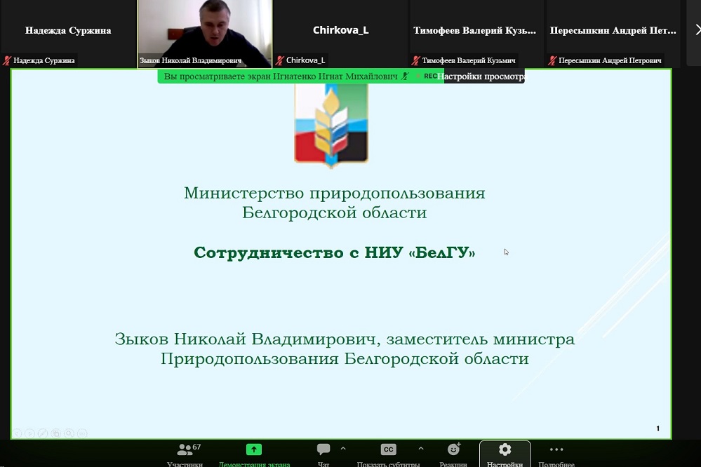 Начальник департамента воспроизводства окружающей среды Белгородской области Николай Зыков в своём содокладе сделал акцент на сотрудничестве ведомства с НИУ «БелГУ» в области изучения водных объектов и недр региона. Он также выразил надежду на плодотворное сотрудничество с институтом по решению актуальной проблемы неприятных запахов.