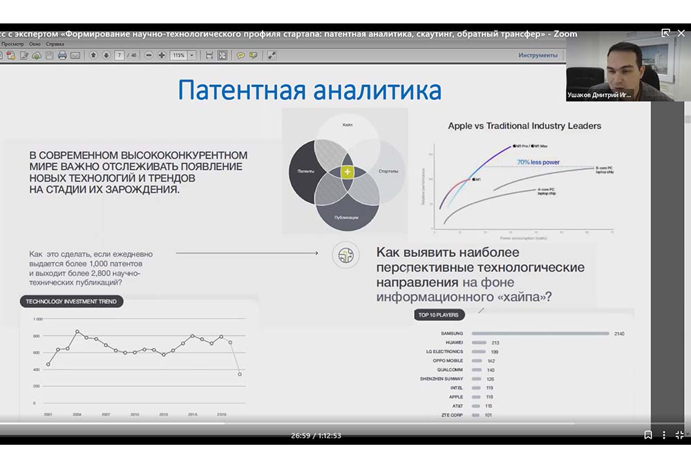 В завершении встречи эксперт дал лаконичные рекомендации участникам по работе с аналитическими сервисами (Яндекс.Патенты, ФИПС, Lens.org и другие), с помощью которых можно проводить самостоятельный первичный анализ патентного поиска и отслеживать лидеров по патентованию в релевантной области для развития будущего стартапа.